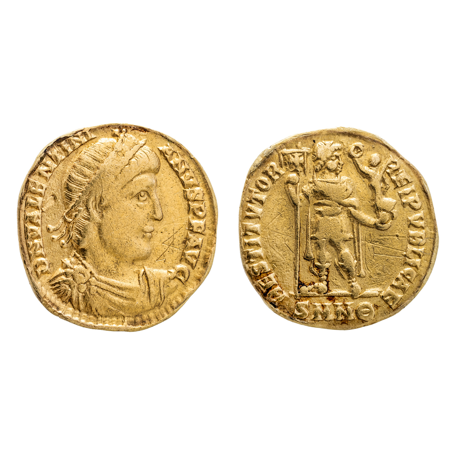 16C. Monedă Solidus, Valentinian I cel Mare, Imperiul Roman de Apus, 364-375 e.n., aur, piesă rară, de colecție