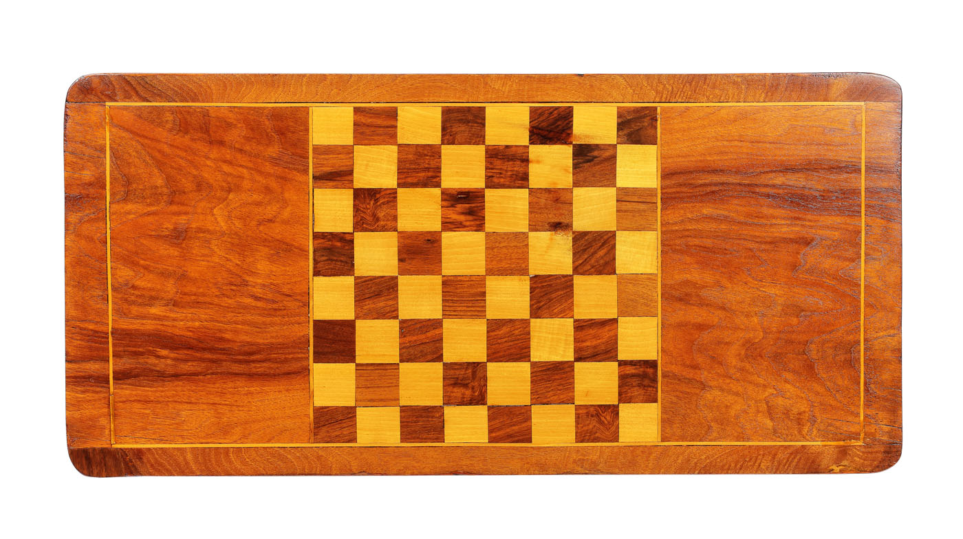 14. Interesantă masă din lemn de nuc, în manieră victoriană, dedicată jocului de șah, sfârșitul sec. XIX
