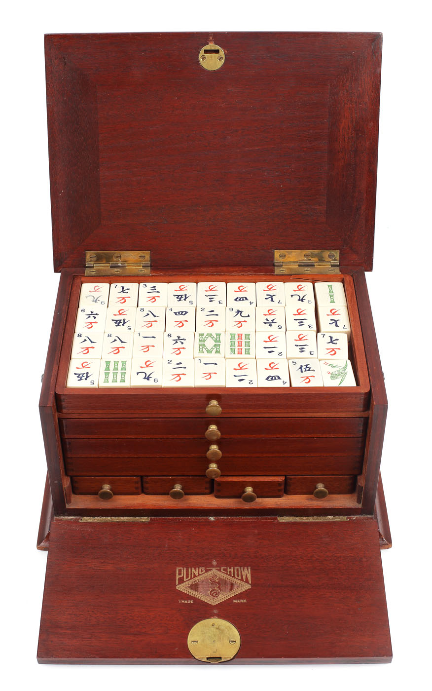 18. Joc de mahjong din lemn de mahon, cu piese din os și bambus, începutul sec. XX