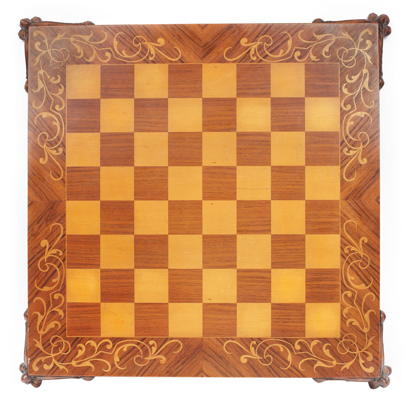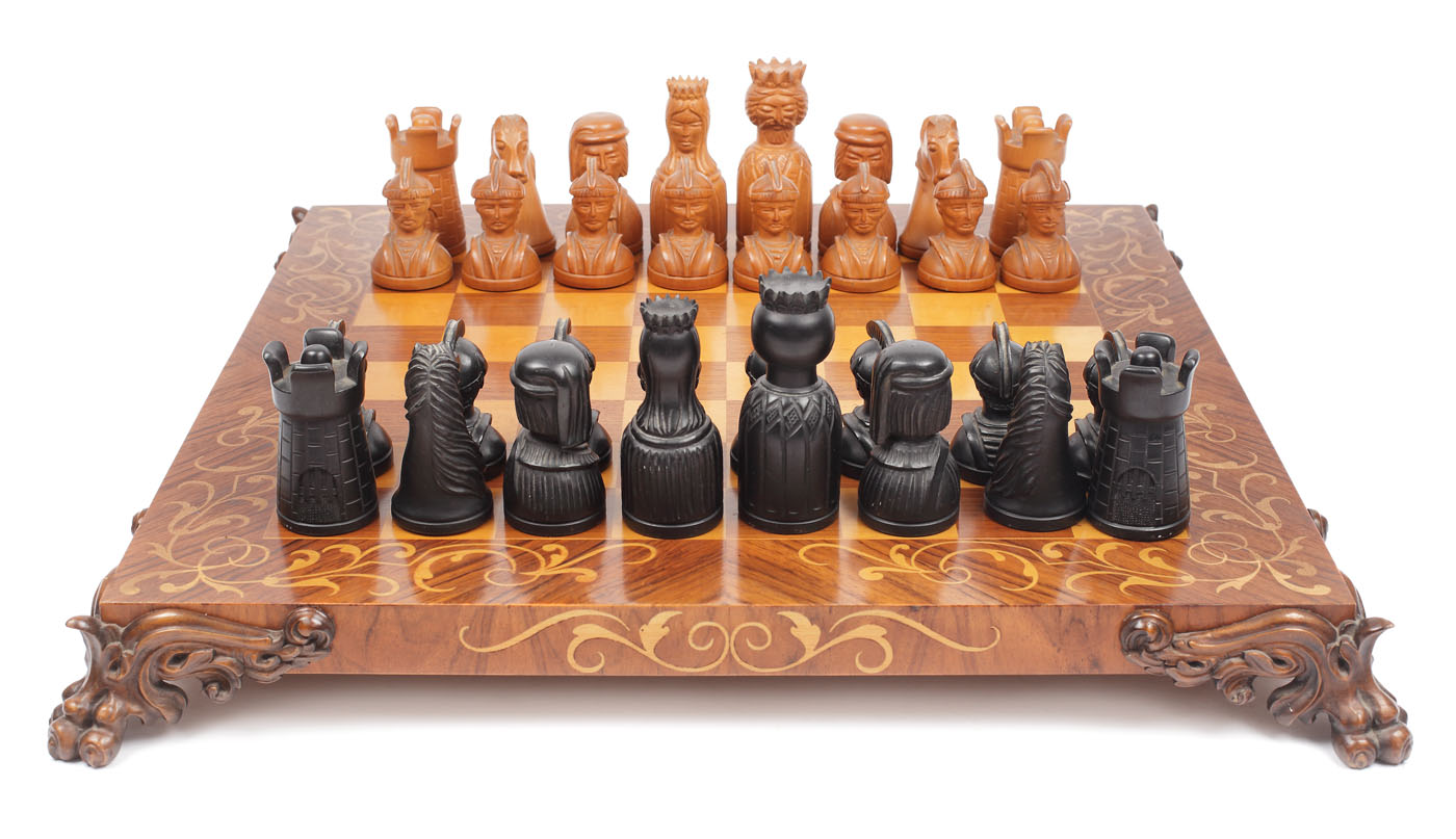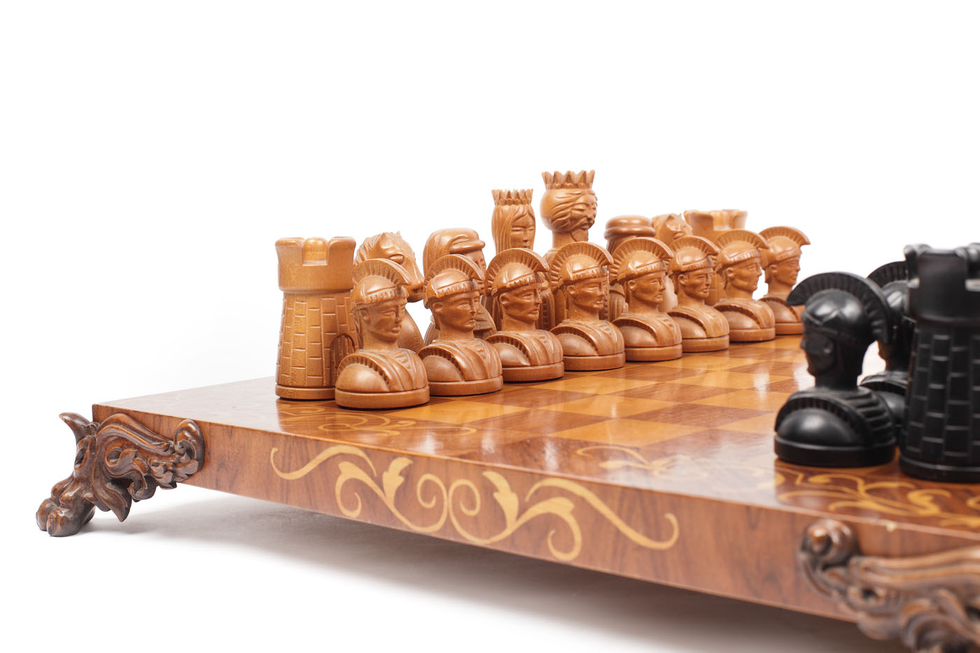 8. Joc de şah de dimensiuni mari, din lemn de nuc, cu intarsii din lemn de fag, având picioare sculptate, a aparţinut soţilor Ceauşescu, însoţit de certificat R.A.A.P.P.S., 1976