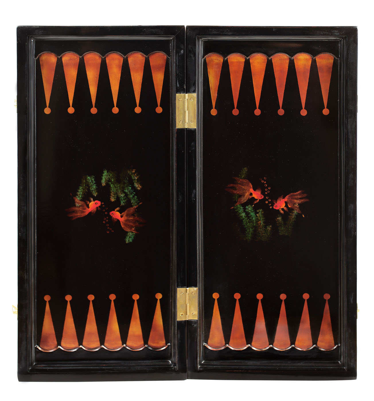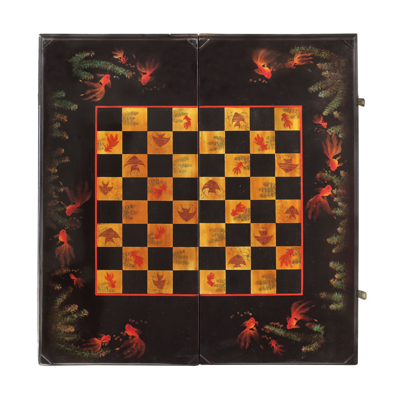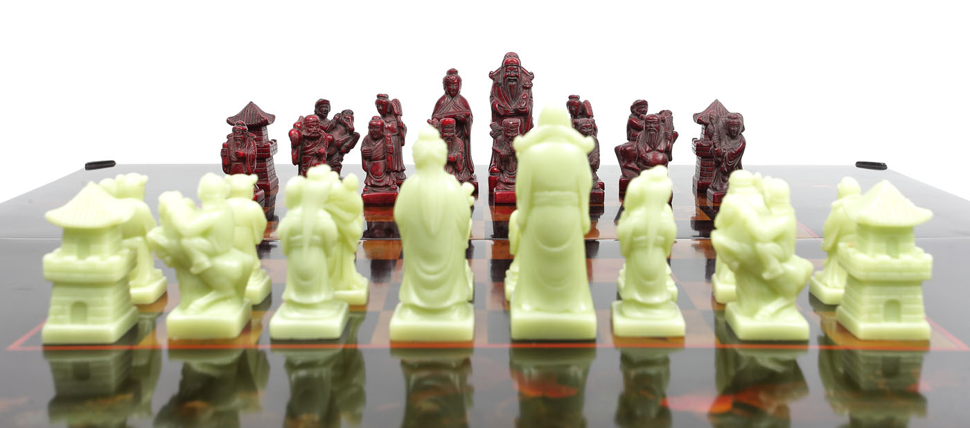 4. Joc de șah de dimensiuni mari, din lemn ebenizat, pictat manual cu decor chinoise [a doua jumătate a sec. XX]