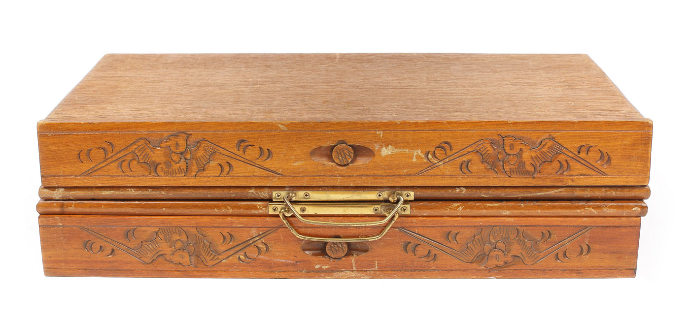 12. Joc de șah de dimensiuni medii, din lemn de paltin și os, decorat cu motive chinoise [a doua jumătate a sec. XX]