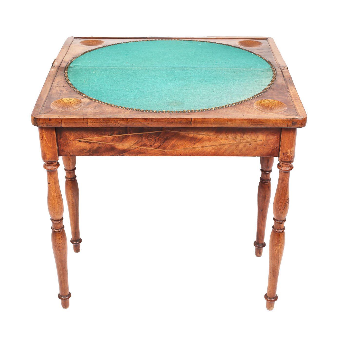 15. Masă din lemn de nuc cu intarsii din lemn de fag, dedicată jocului de şah şi altor jocuri de societate, începutul sec. XX