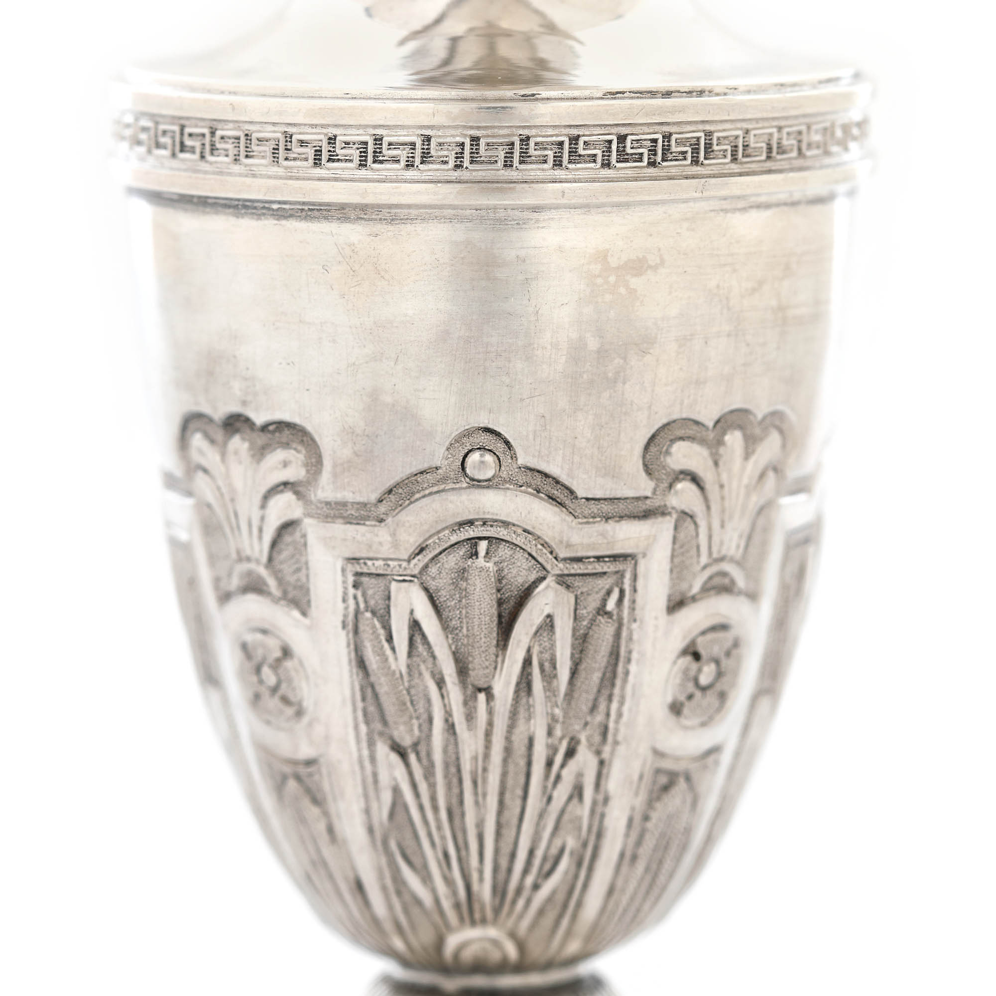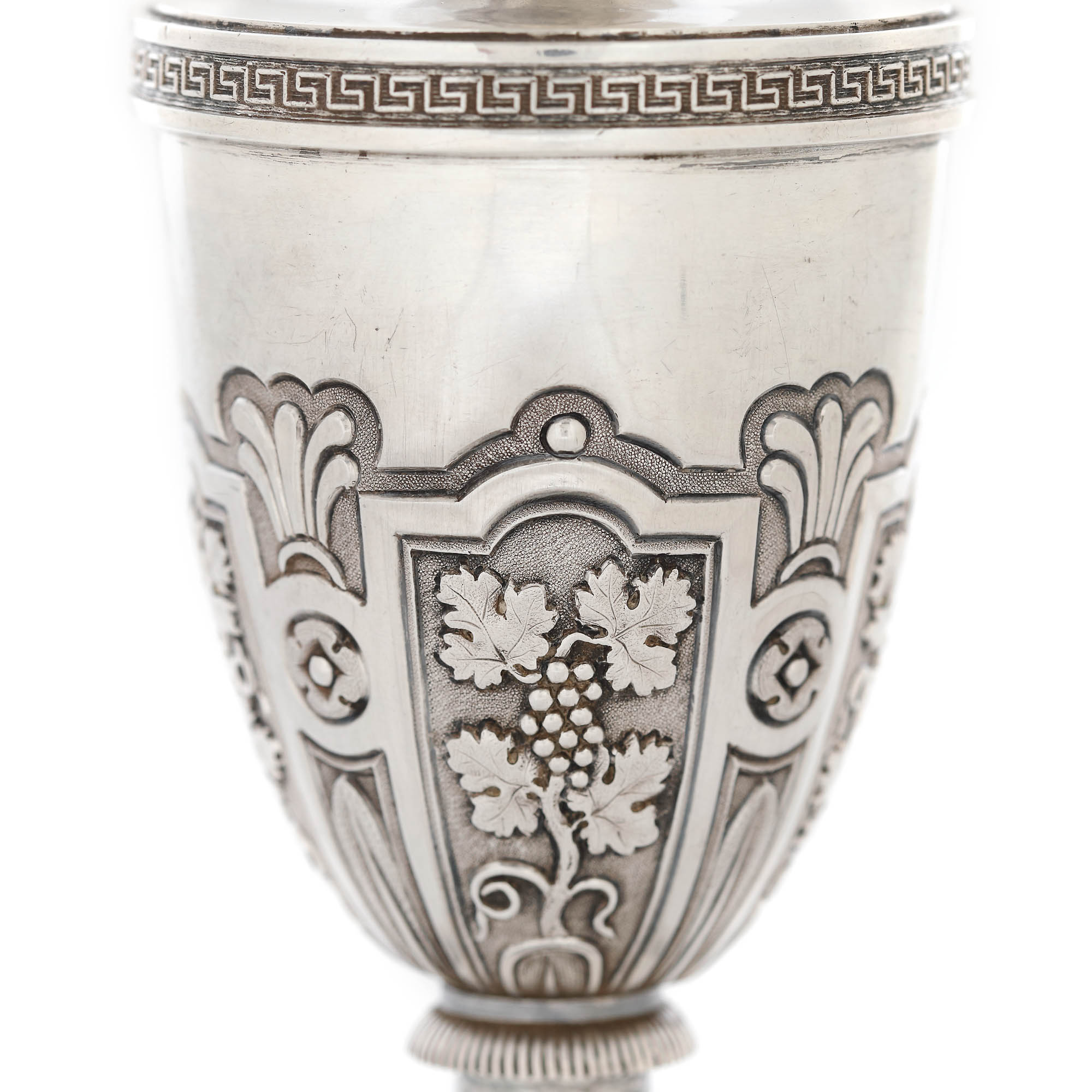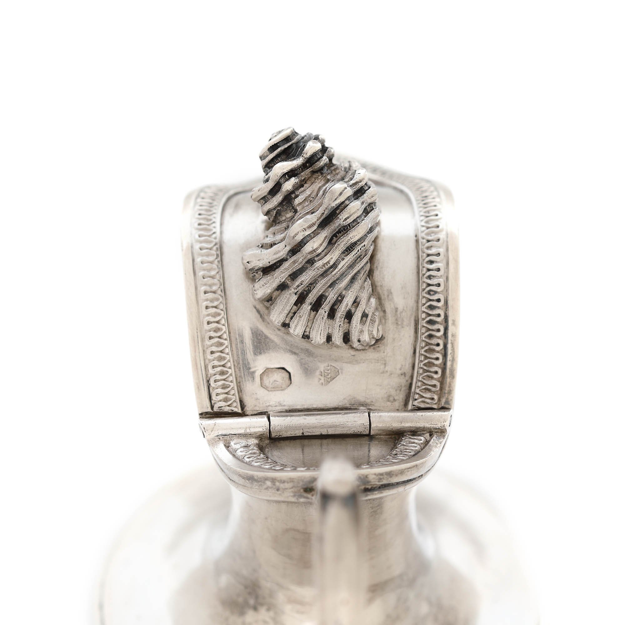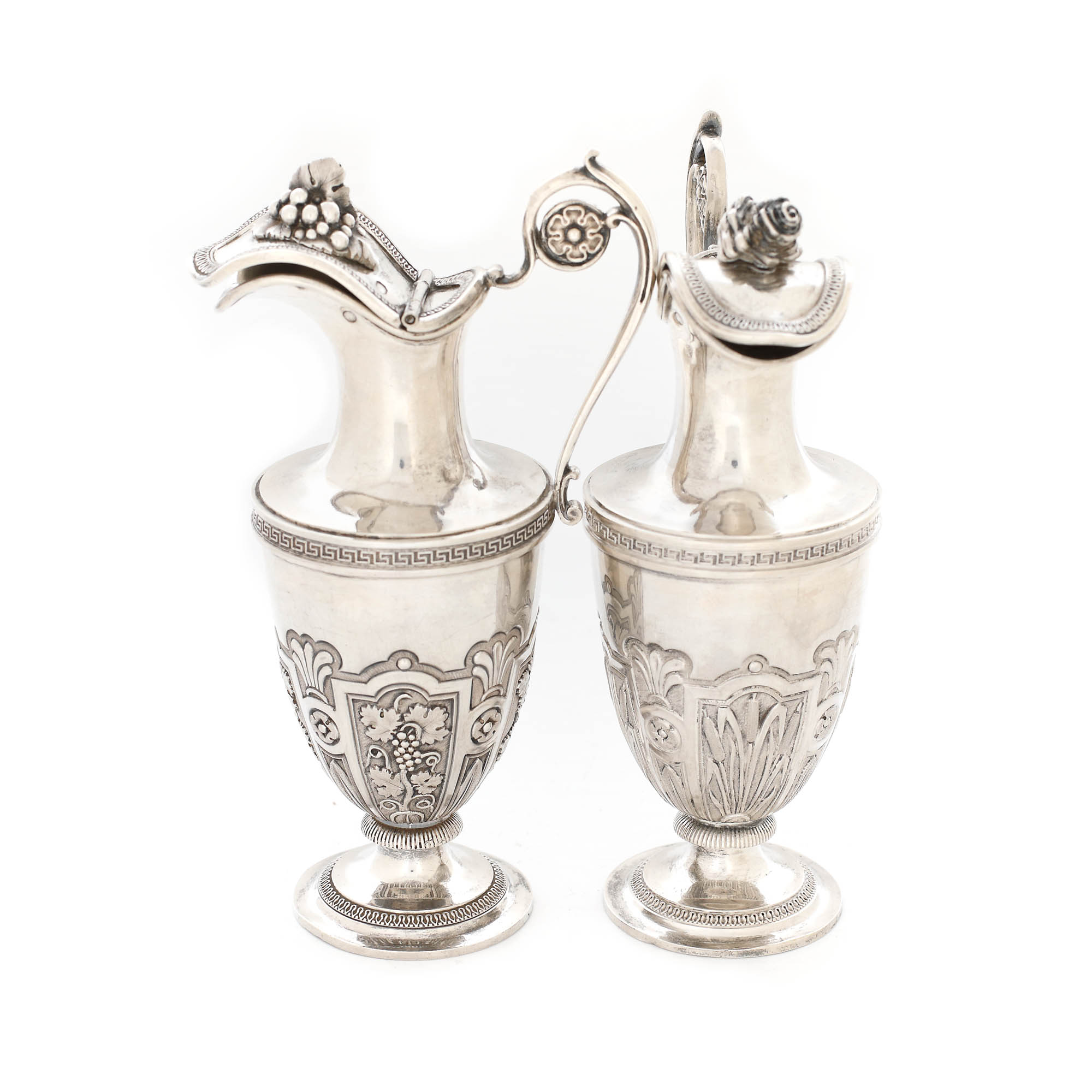 21. Extraordinară pereche de carafe Empire din argint, decorată cu elemente struguri, viță-de-vie, plante lacustre și scoică, în tehnica repoussé și gravură manuală, cca. 1797-1809, piesă de colecție, provine din colecția Garabet și Sabina Avachian
