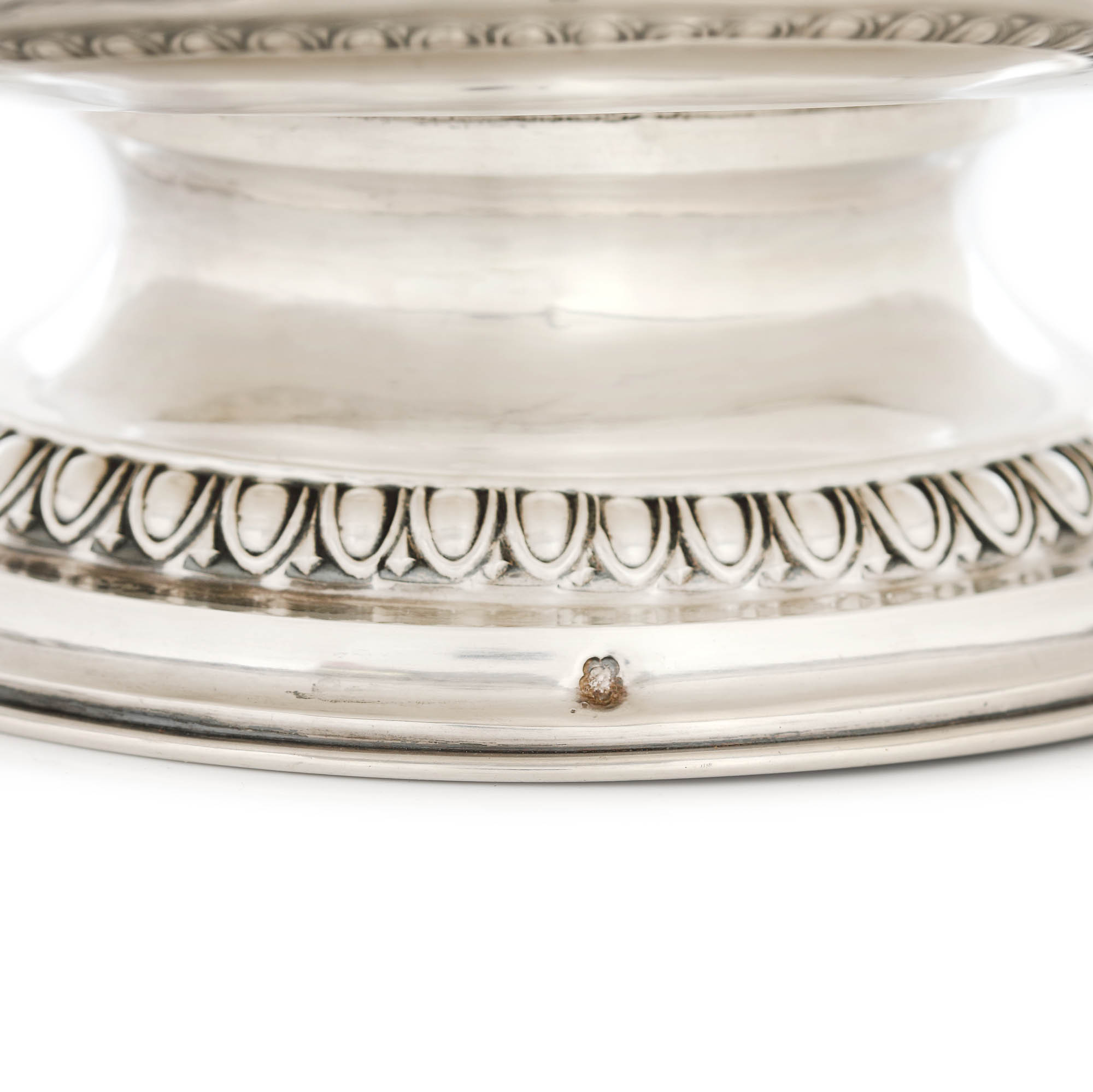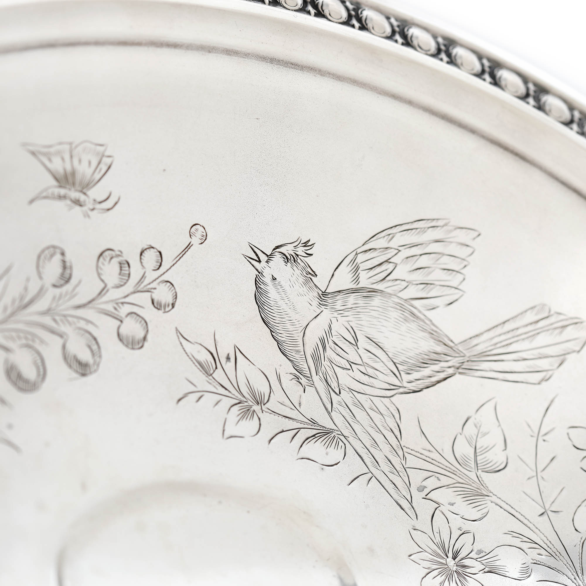 13. Fructieră cu anse Belle Époque din argint, autor Hermann Südfeld, gravat manual cu păsări și flori, cca. 1880