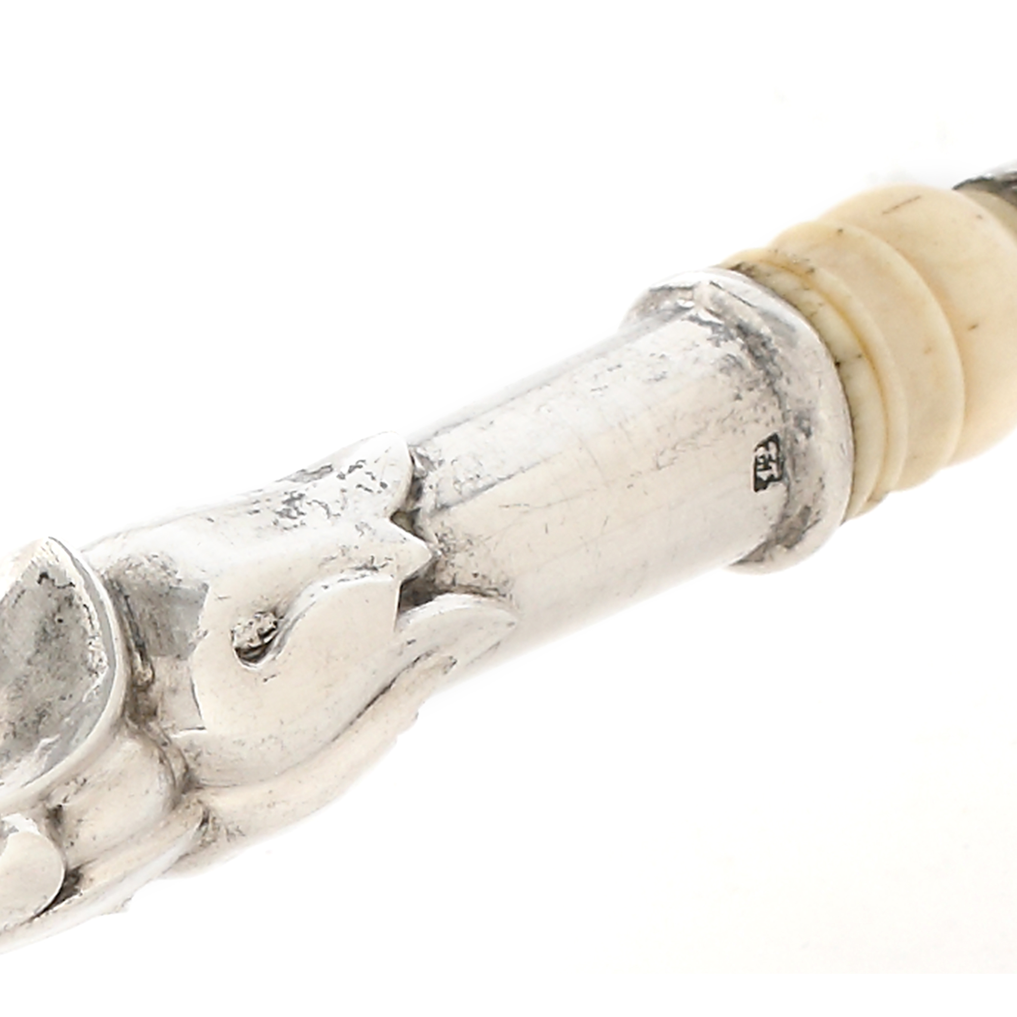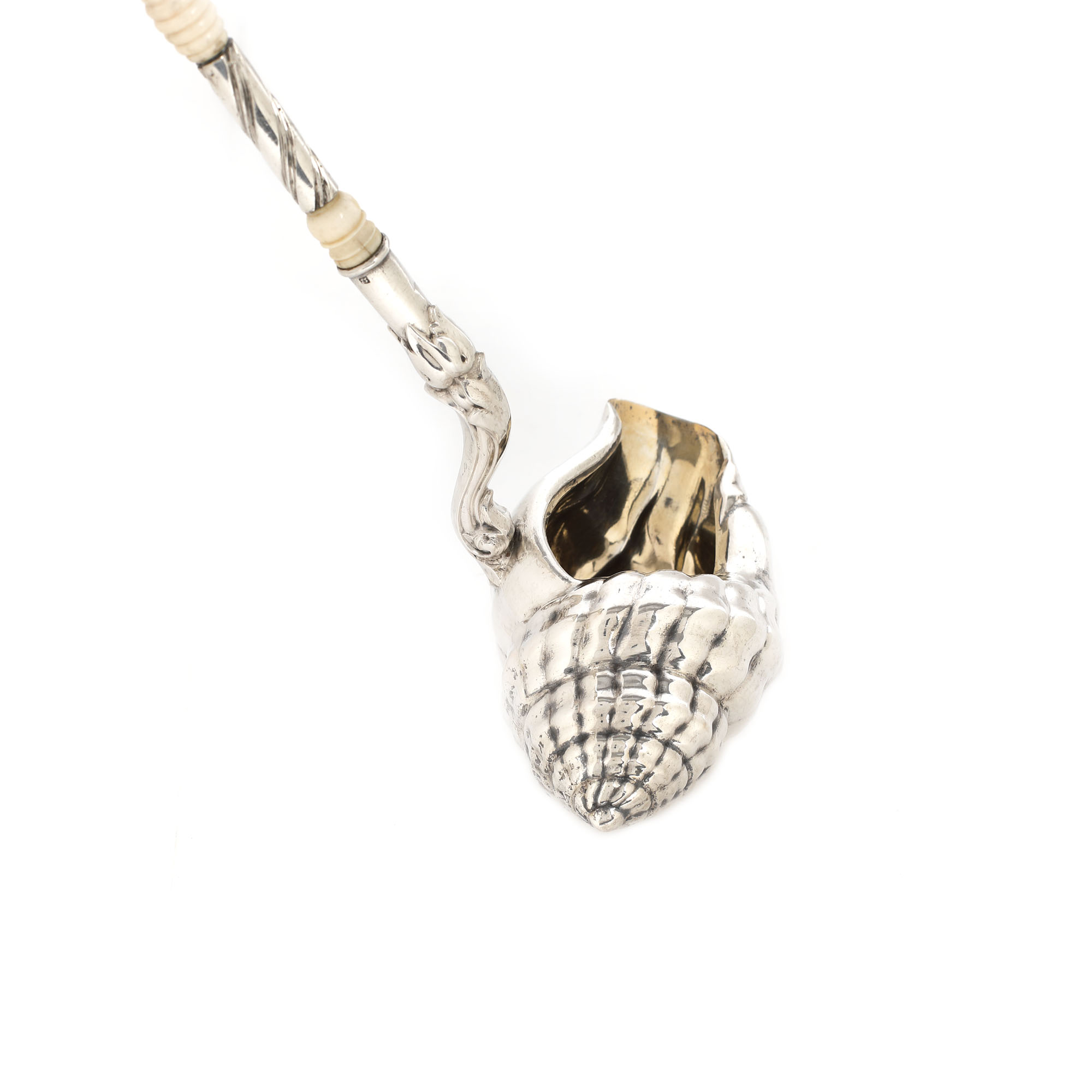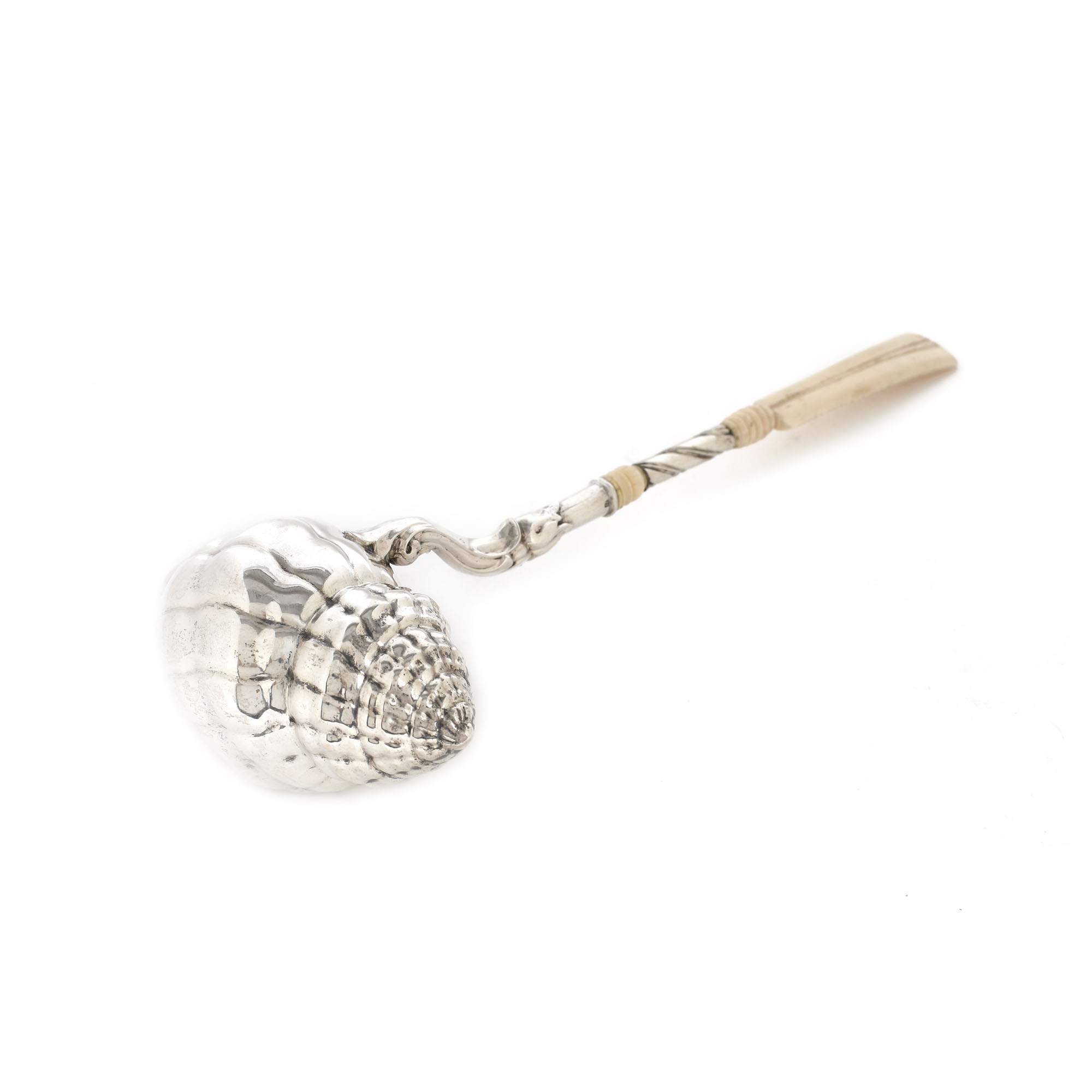 8. Polonic din argint, pentru punch, în forma unei cochilii, realizată în tehnică rară repoussé, cu mâner din os, cca. 1750, provine din colecția Garabet și Sabina Avachian