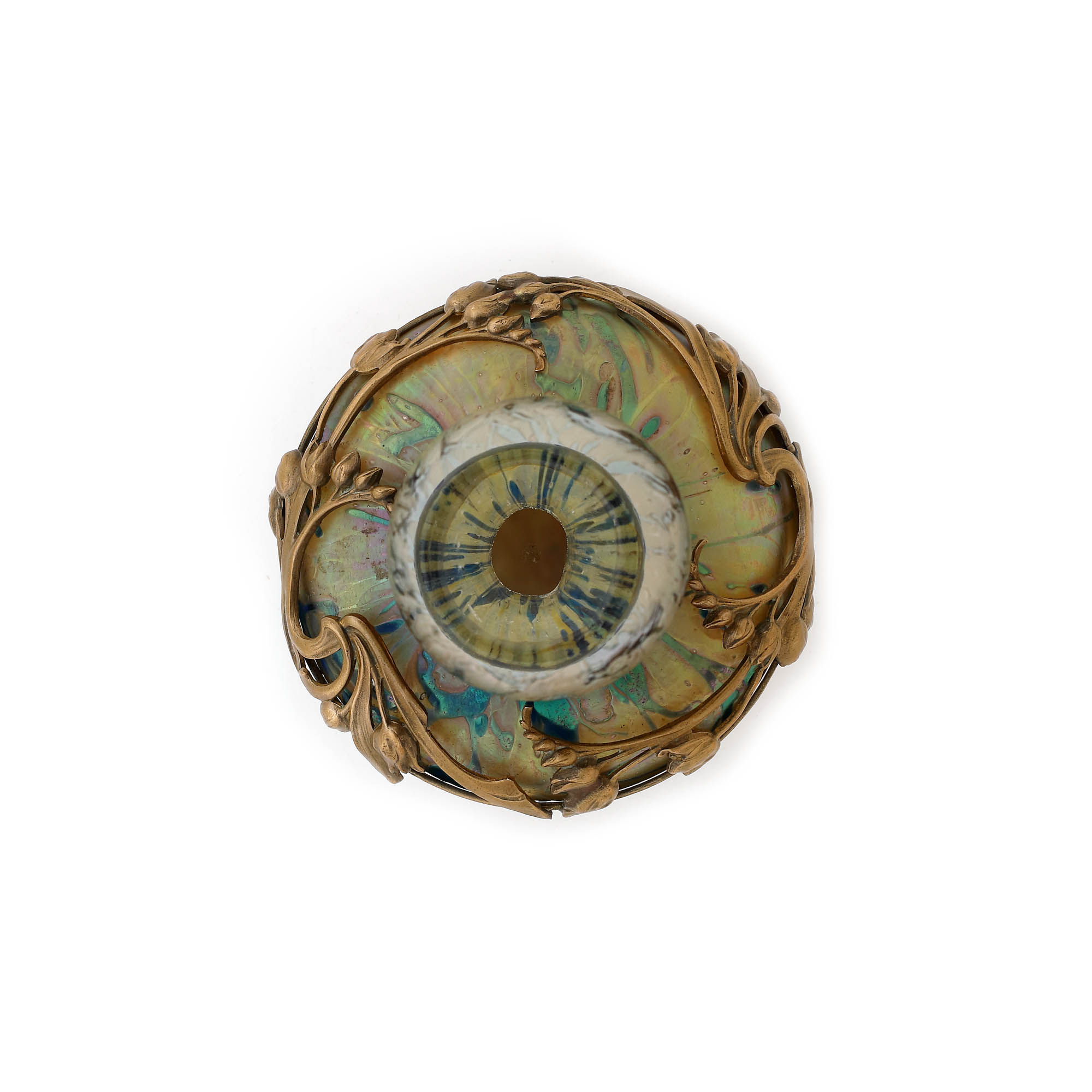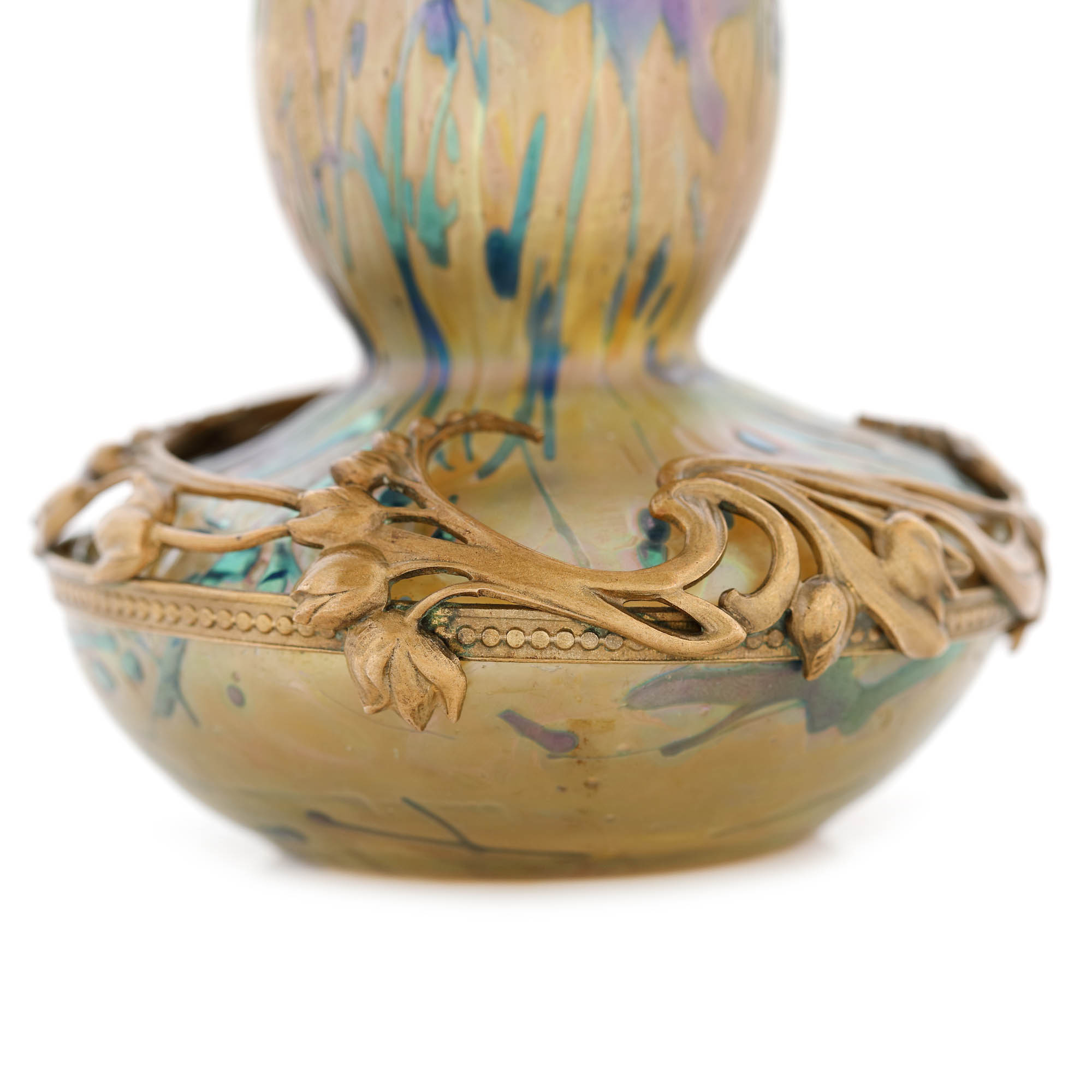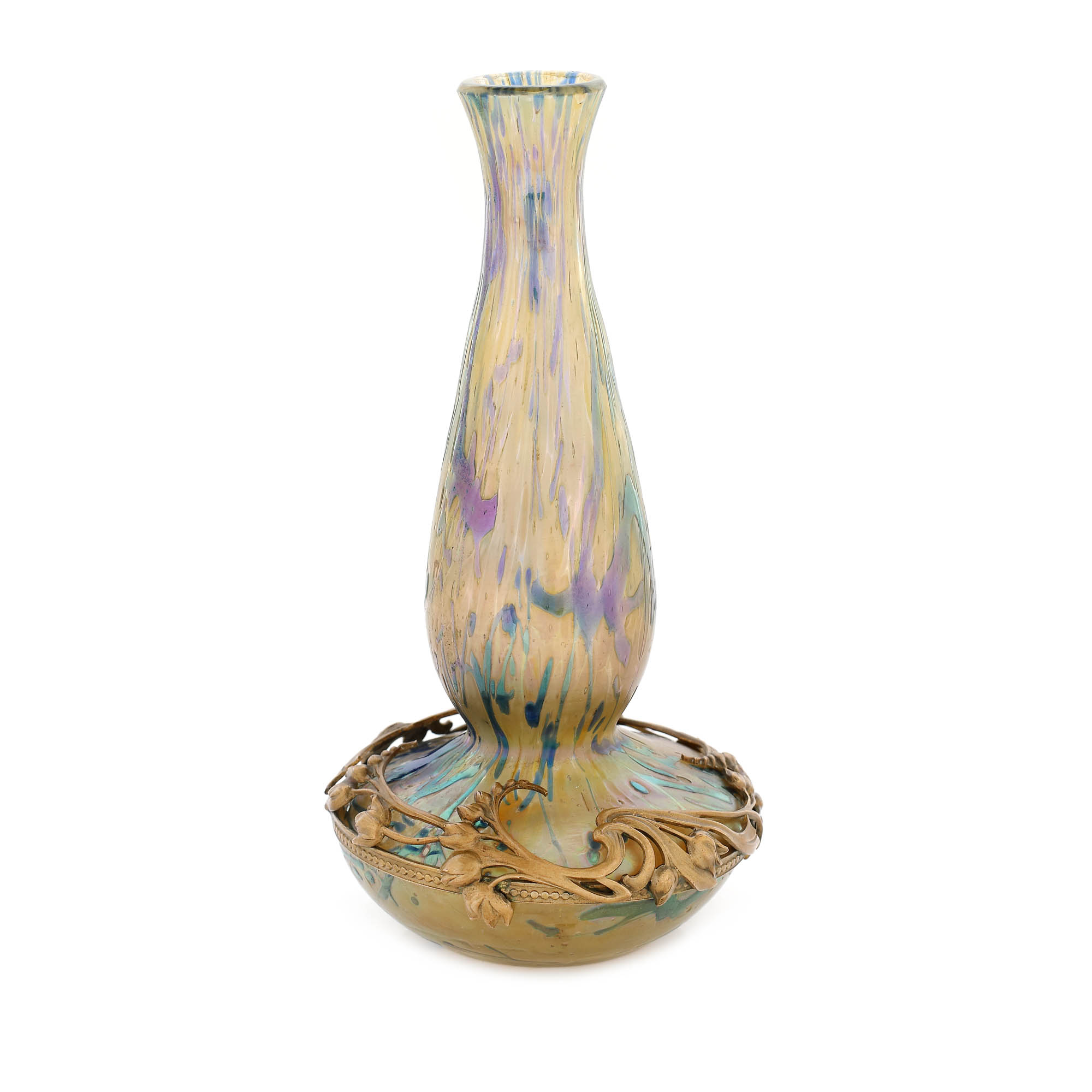40. Rară solifloră Art Nouveau Loetz Phaenomen, în suport din bronz aurit decorat cu motive florale, cca. 1900, piesă de colecție
