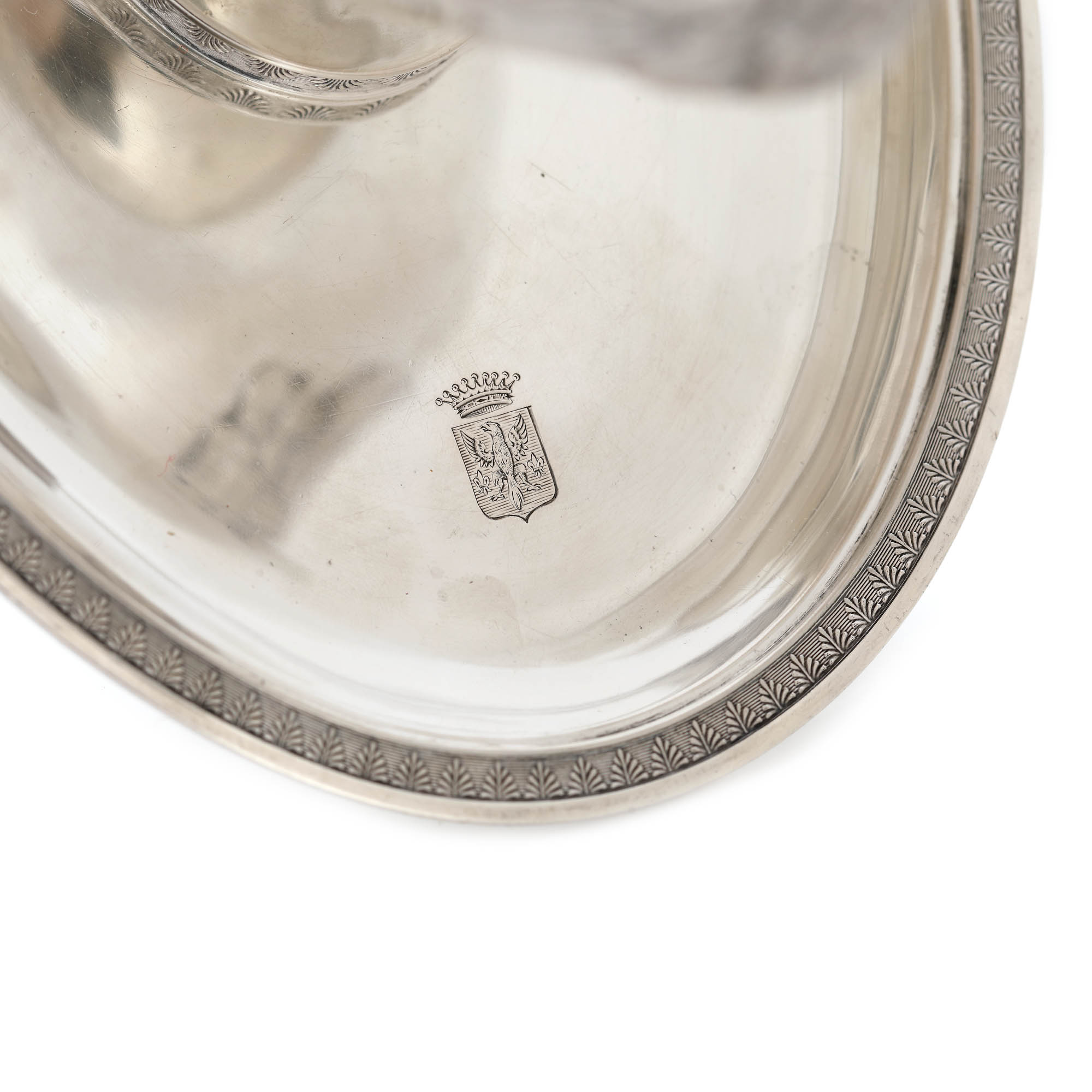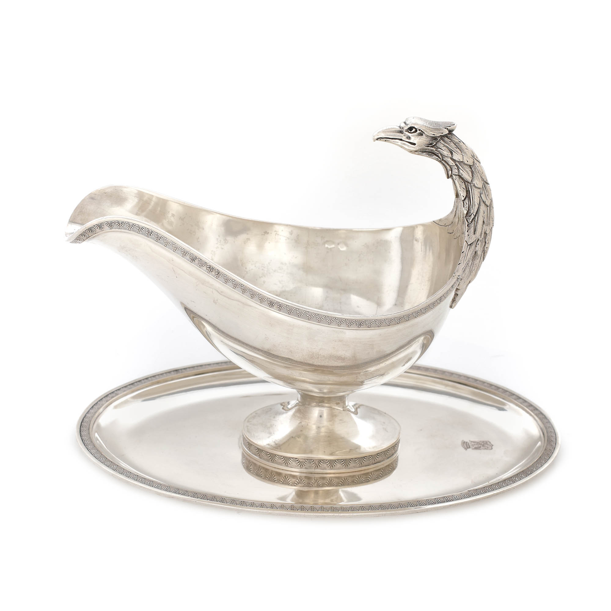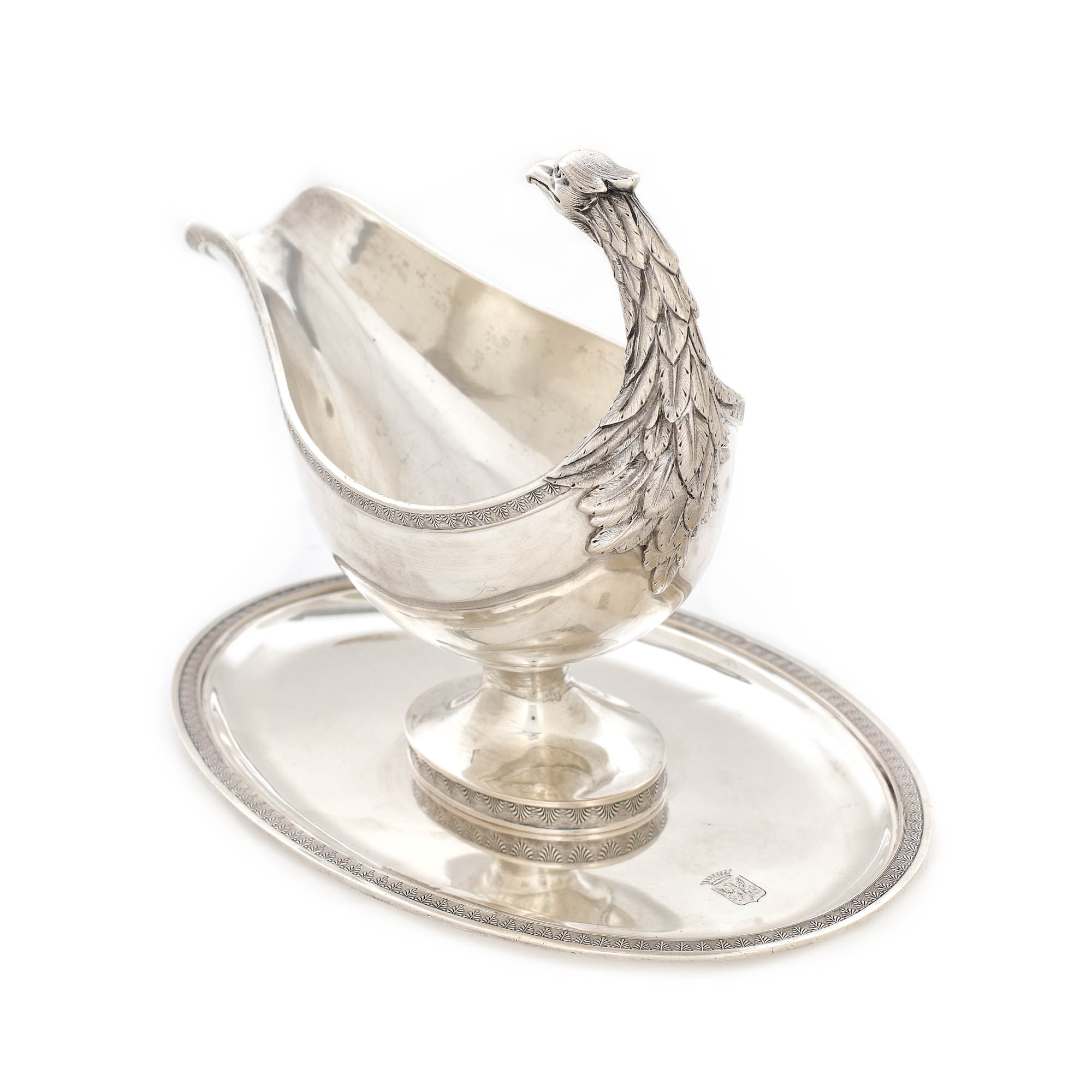 26. ”Saucière casque” - recipient pentru sos, din argint, decorat cu capul unui vultur, blazon princiar și elemente stilistice Neo-Clasice, tehnică de repoussé, guilloché, executat manual, cca. 1800, piesă de colecție