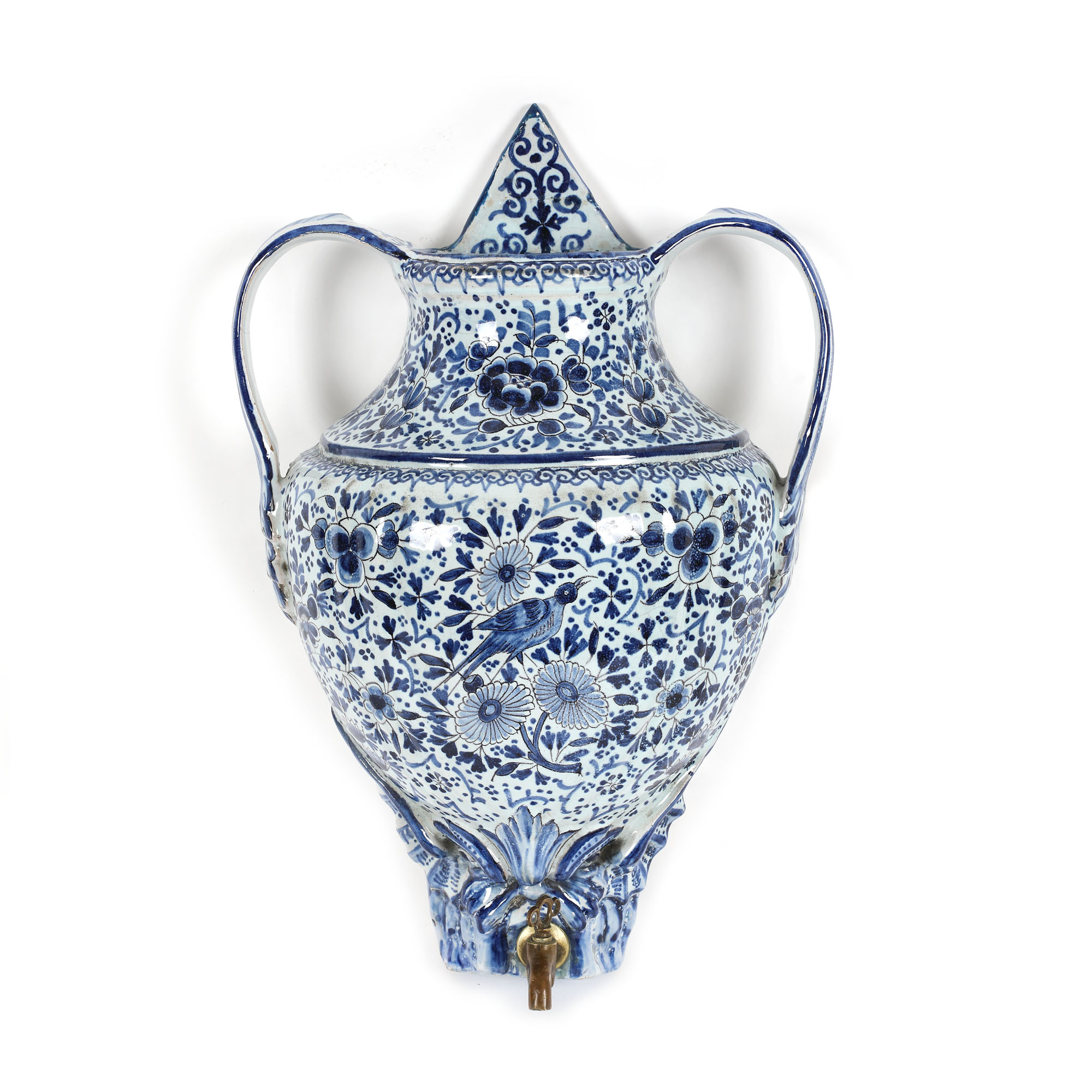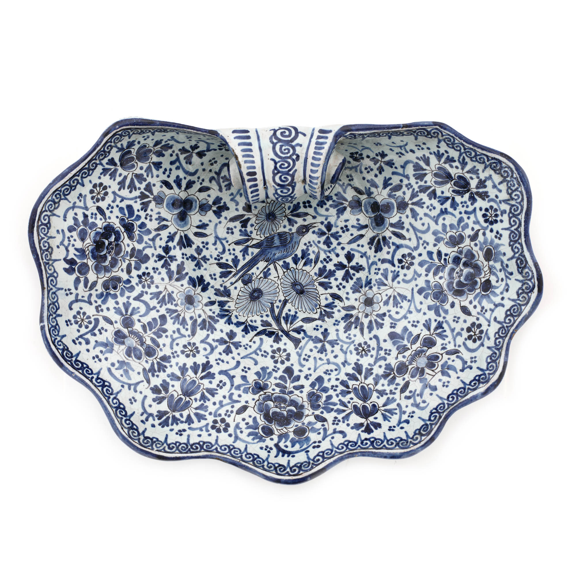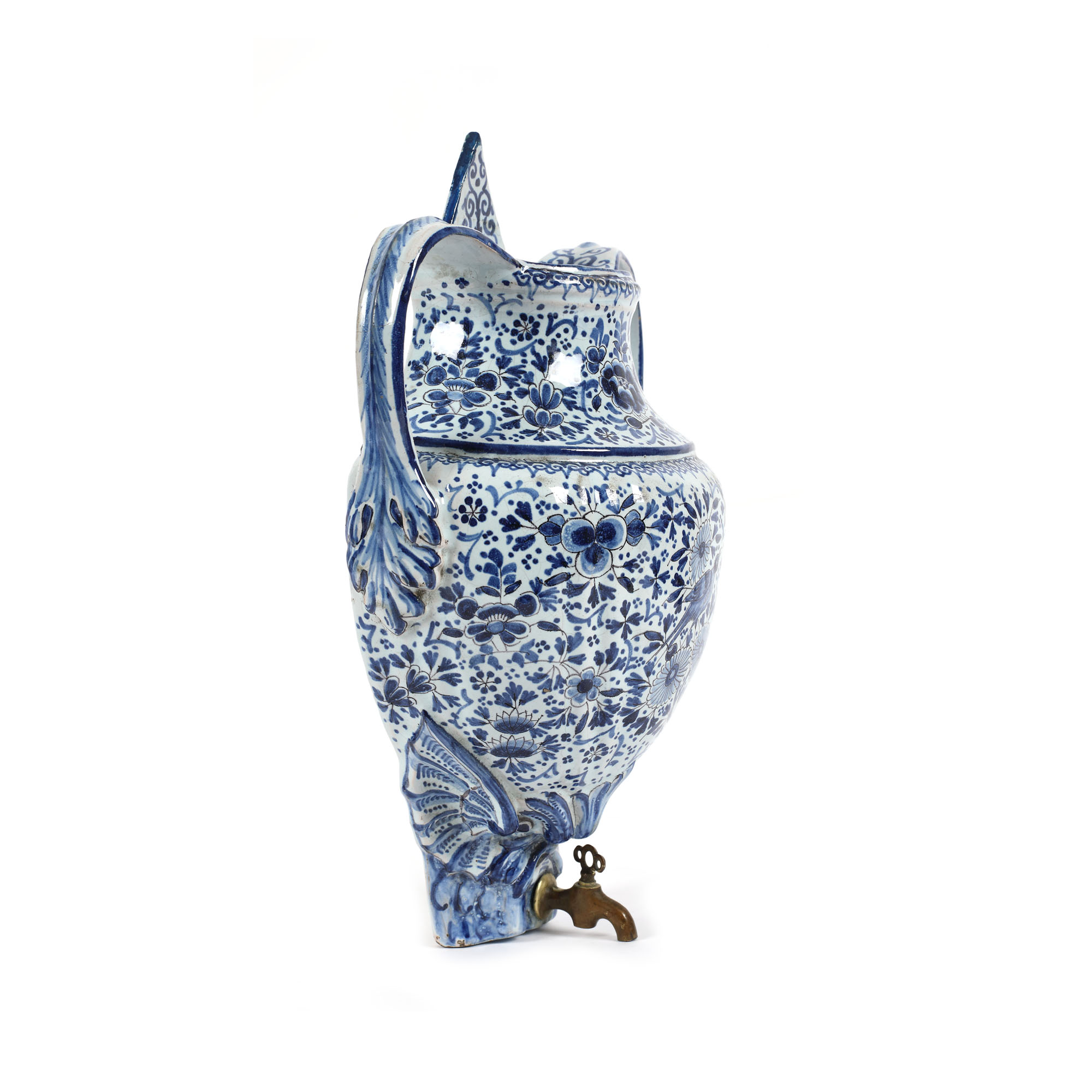 30. Set Delft, realizat în manufactura "De Klaauw", compus din fântână și bazin, decorată cu motive crizanteme și păsări, pește fantastic și scoică de mari dimensiuni în reprezentare barocă, cca. 1680-1700, piesă de colecție