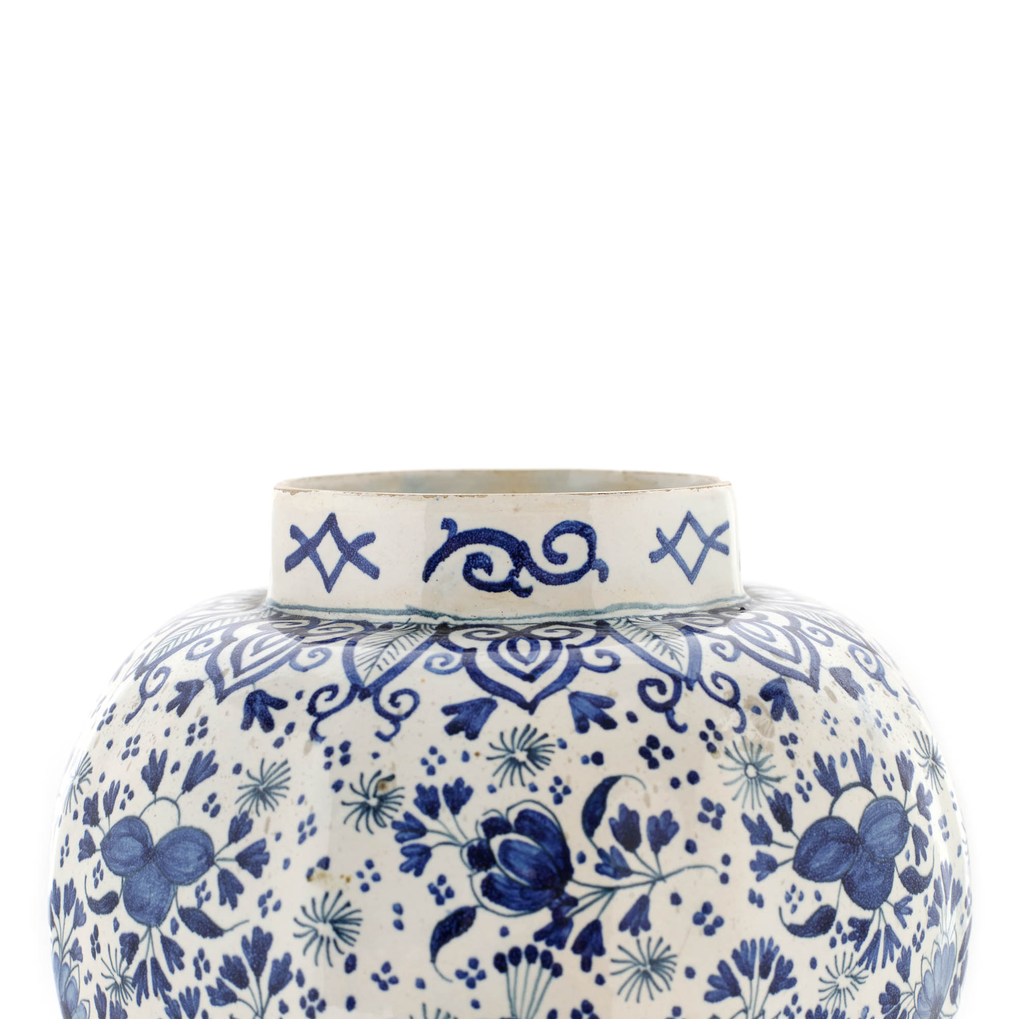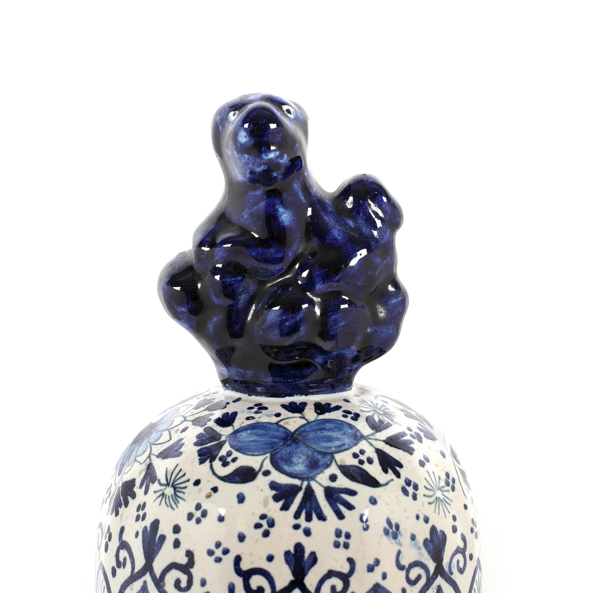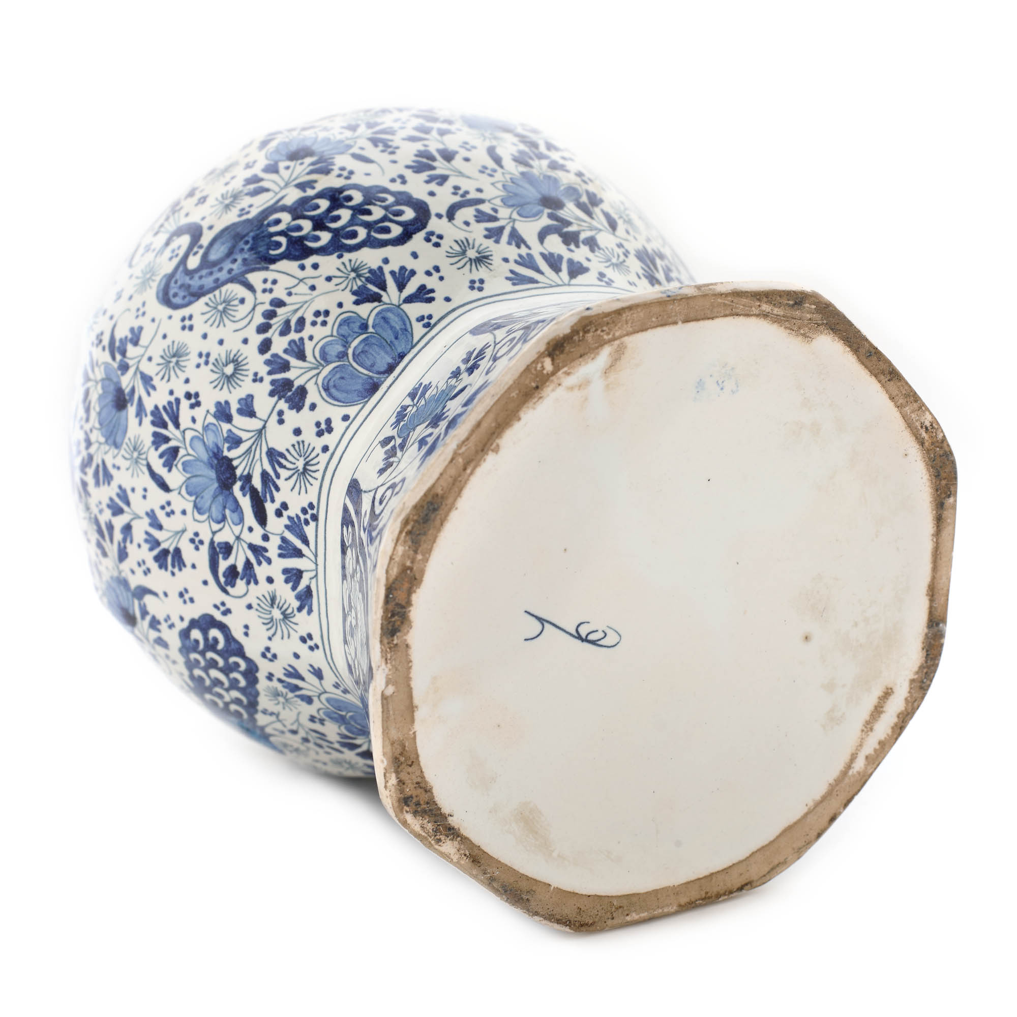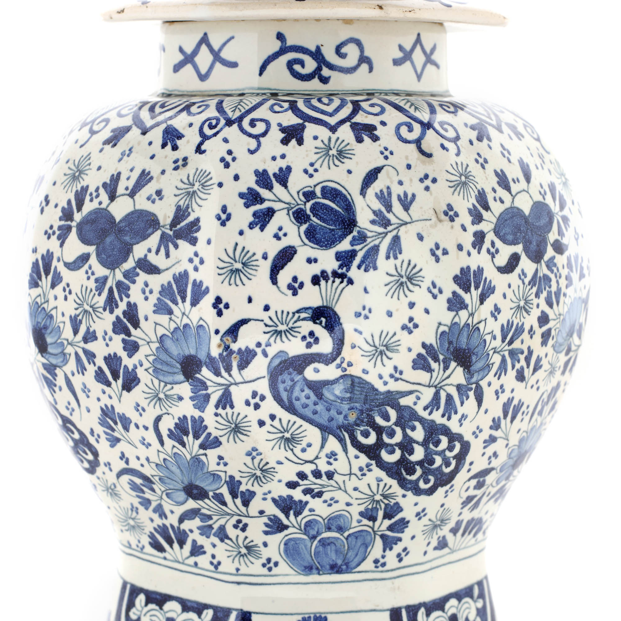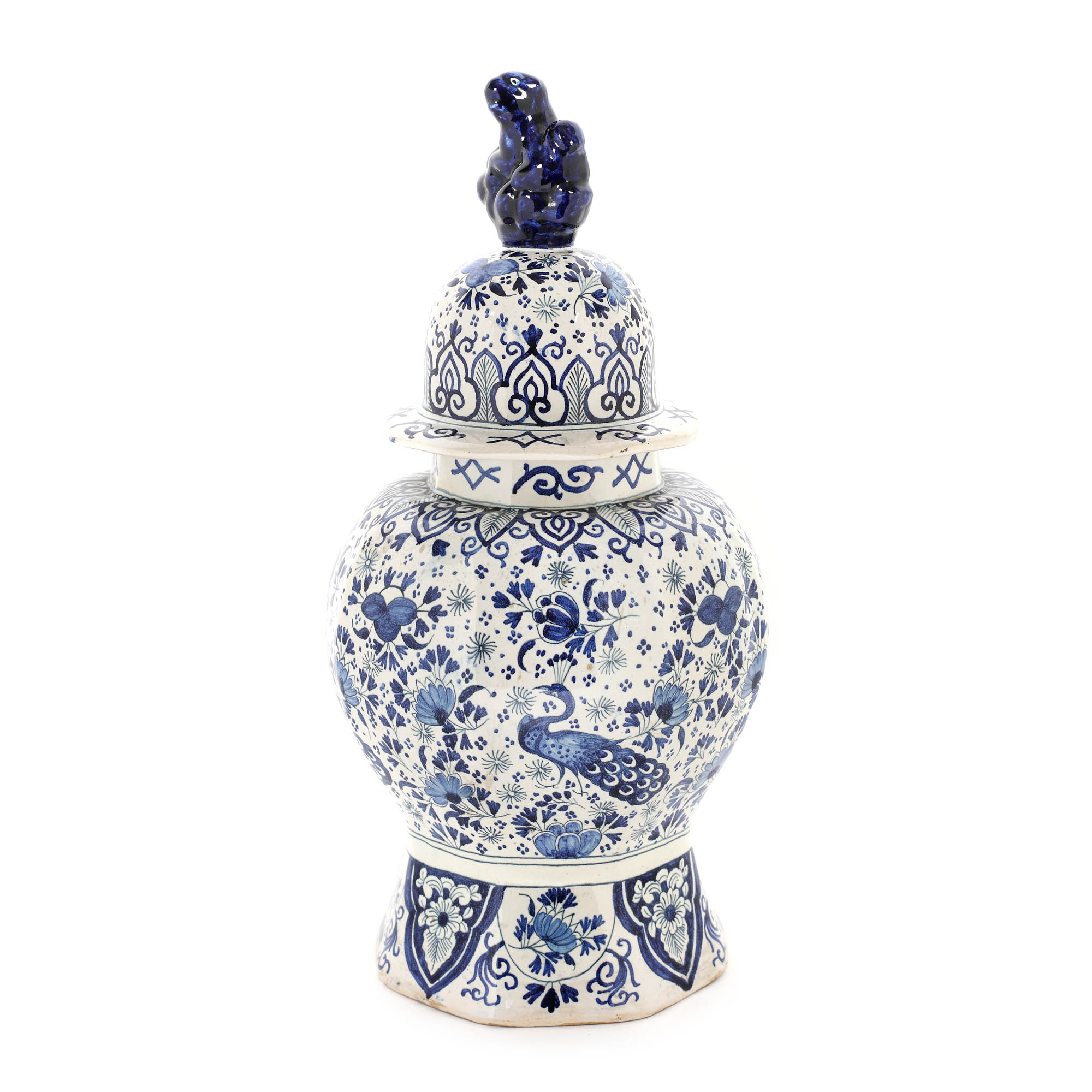 29. Vas cu capac Delft, realizat în manufactura "De Klaauw", cu decor persan cu păuni și animal fantastic, cca. 1720-1740