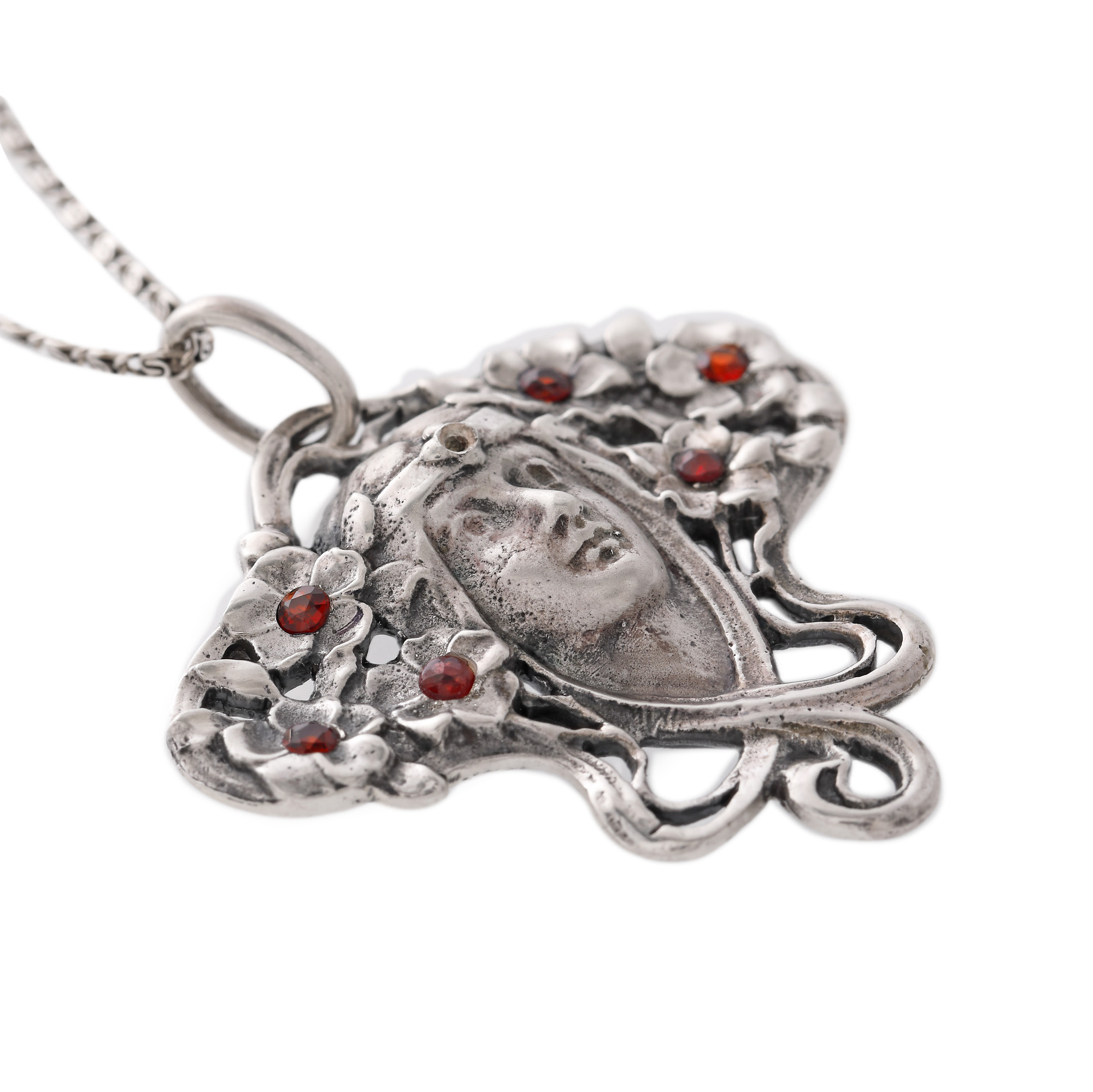 19. Lanț cu pandantiv din argint, în stil Art Nouveau, decorat cu granate, cca. 1900
