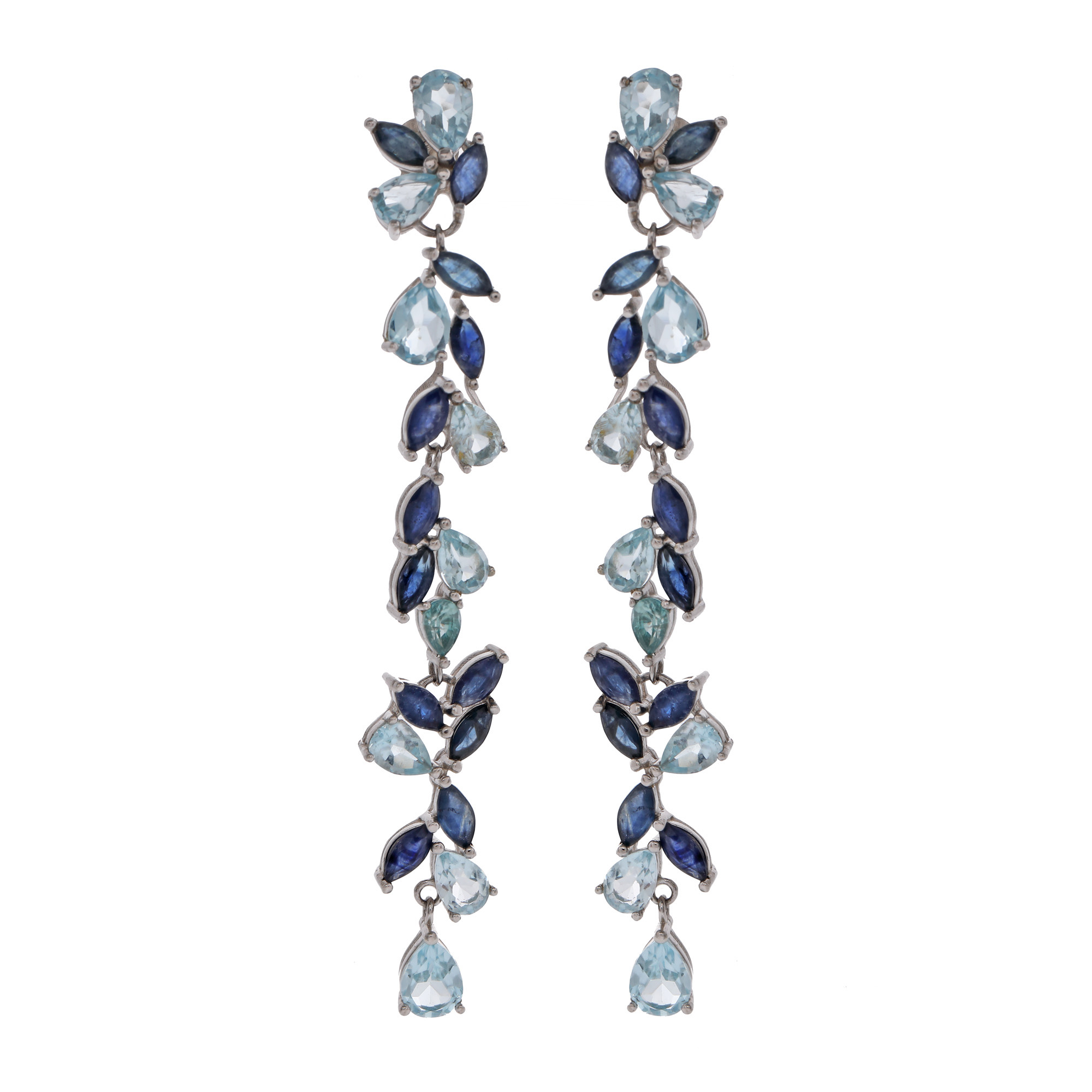 18 topaze pară, culoare bleu, claritate eye-clean, cca. 6,00 ct. și 24 safire marchize, culoare albastru, claritate SI-moderately included, cca. 8,00 ct.