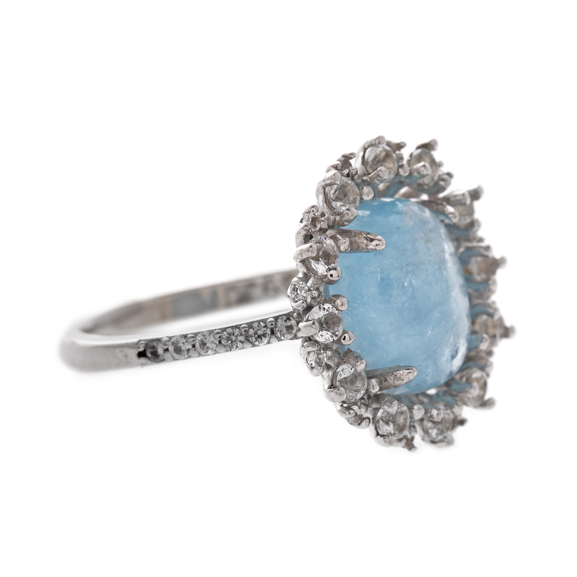 3 acvamarine ovale caboșon, culoare bleu, claritate heavily included, cca. 4,80 ct. și 72 topaze rotund fațetate, culoare alb, claritate eye-clean, cca. 1 ct.