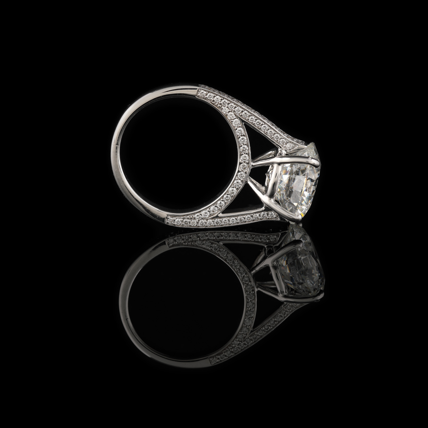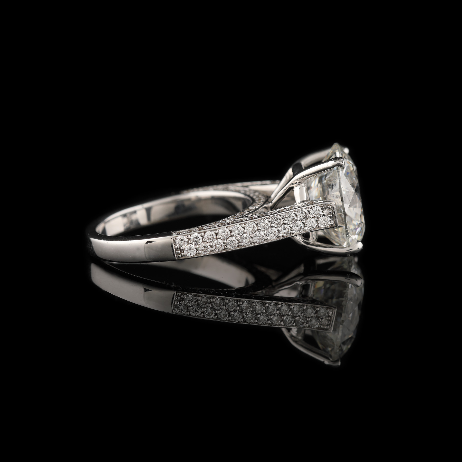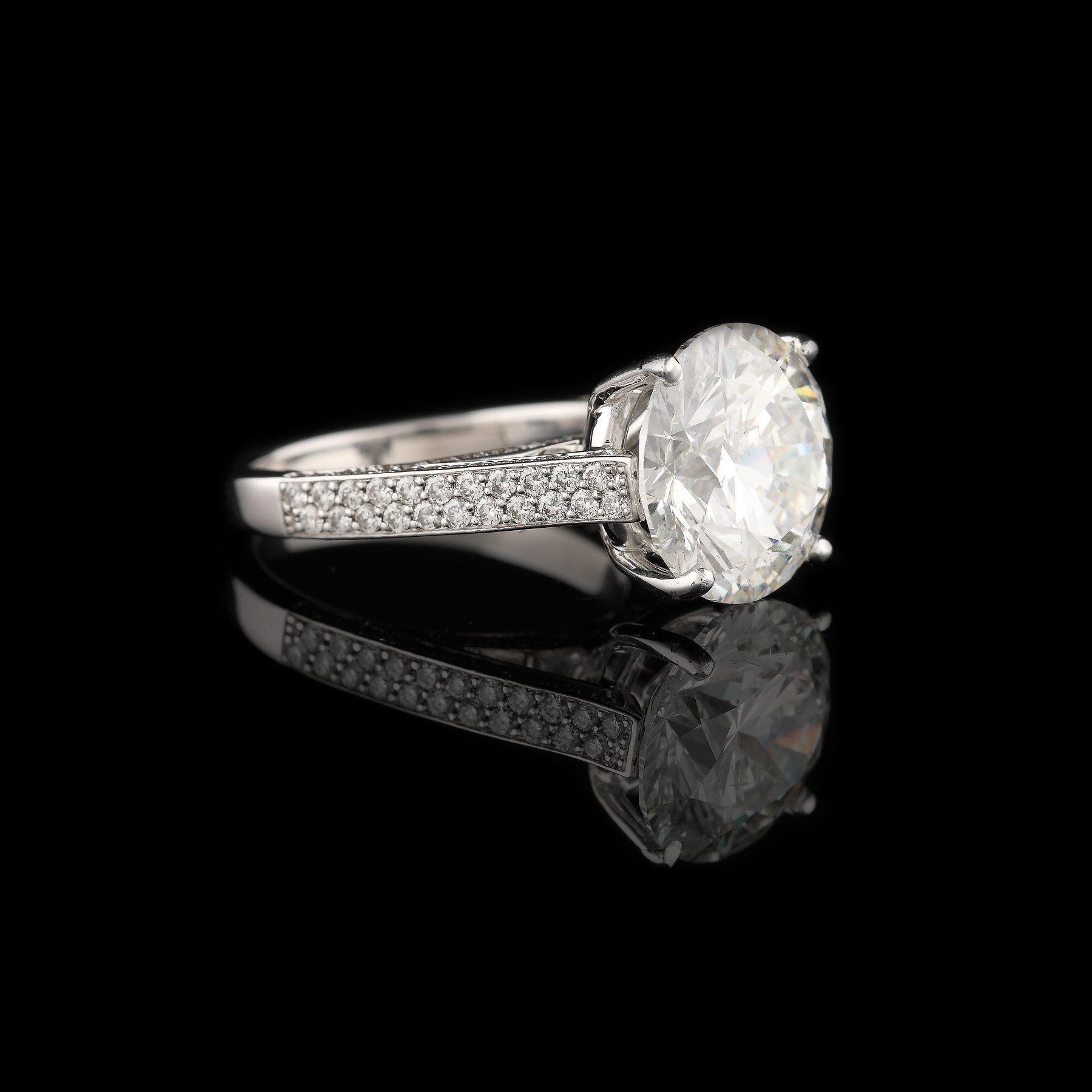 1 diamant rotund briliant, culoare G, claritate SI2, cca. 6,02 ct. și 132 diamante rotunde briliant, culoare F-G, claritate VS, cca. 1,2 ct.