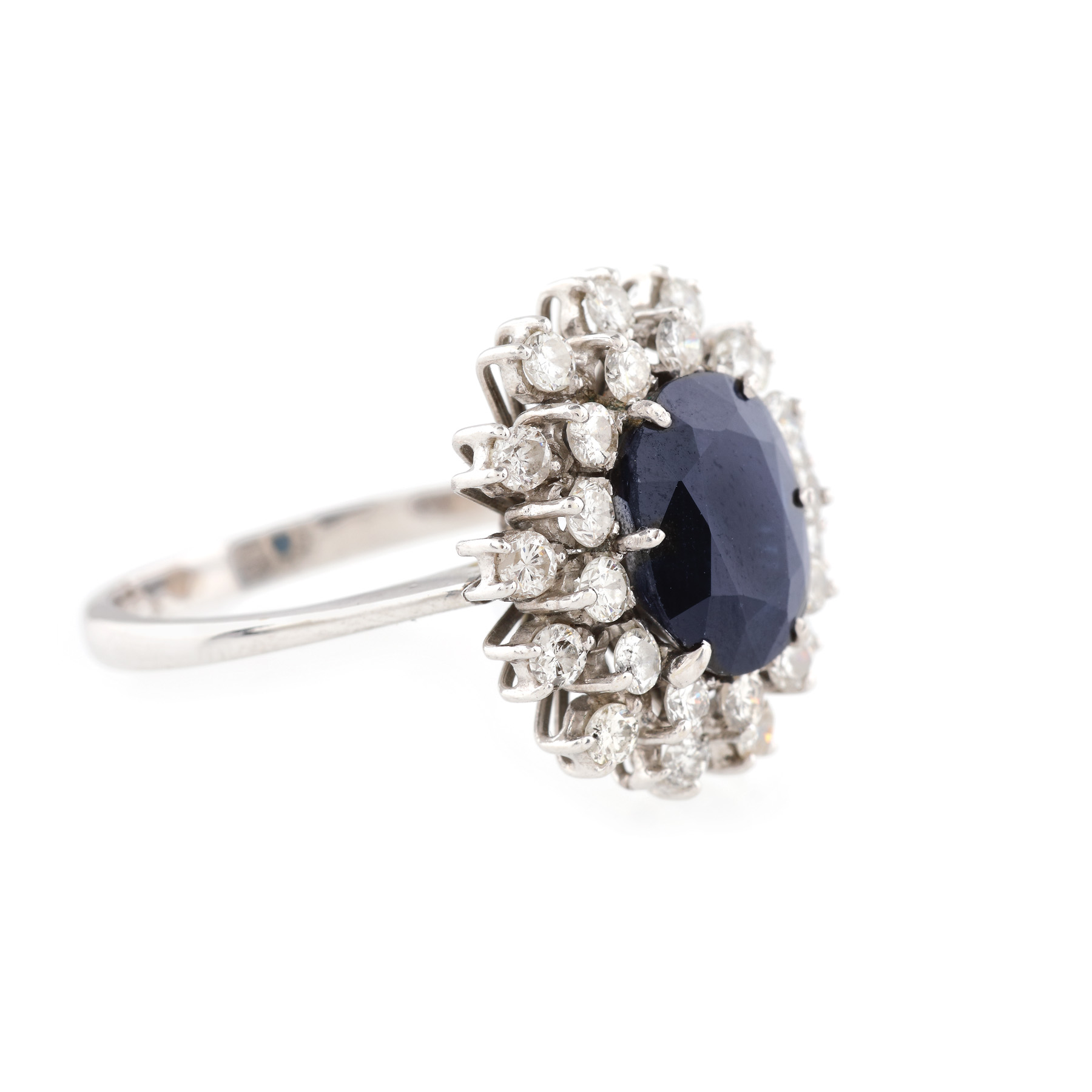 1 safir oval fațetat, culoare albastru, claritate eye-clean, cca. 4,0 ct. și 28 diamante rotunde briliant, culoare G-H, claritate SI2-I1, cca. 1,4 ct.