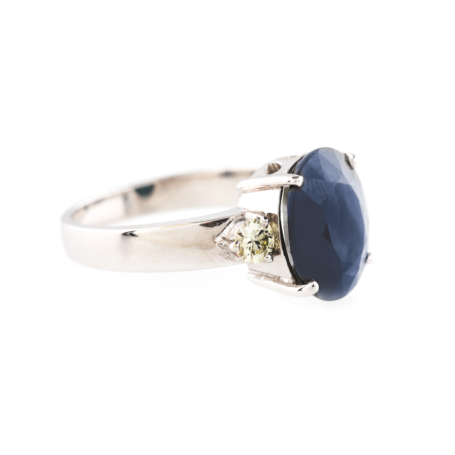 1 safir oval fațetat, culoare albastru-verzui, claritate eye-clean, cca. 5,8 ct. și 2 diamante rotunde briliant, culoare K, claritate VS2-SI1, cca. 0,28 ct.