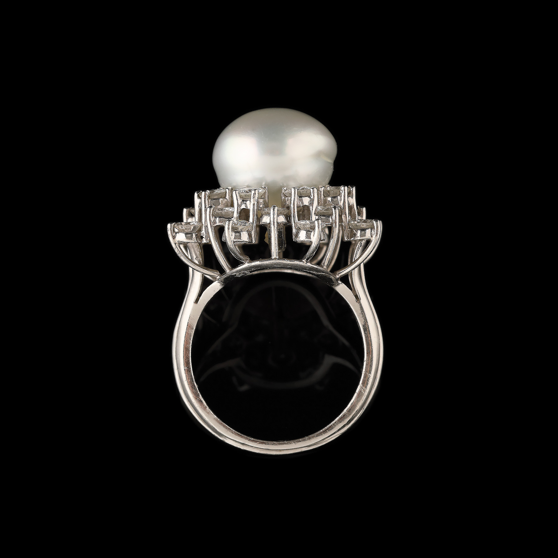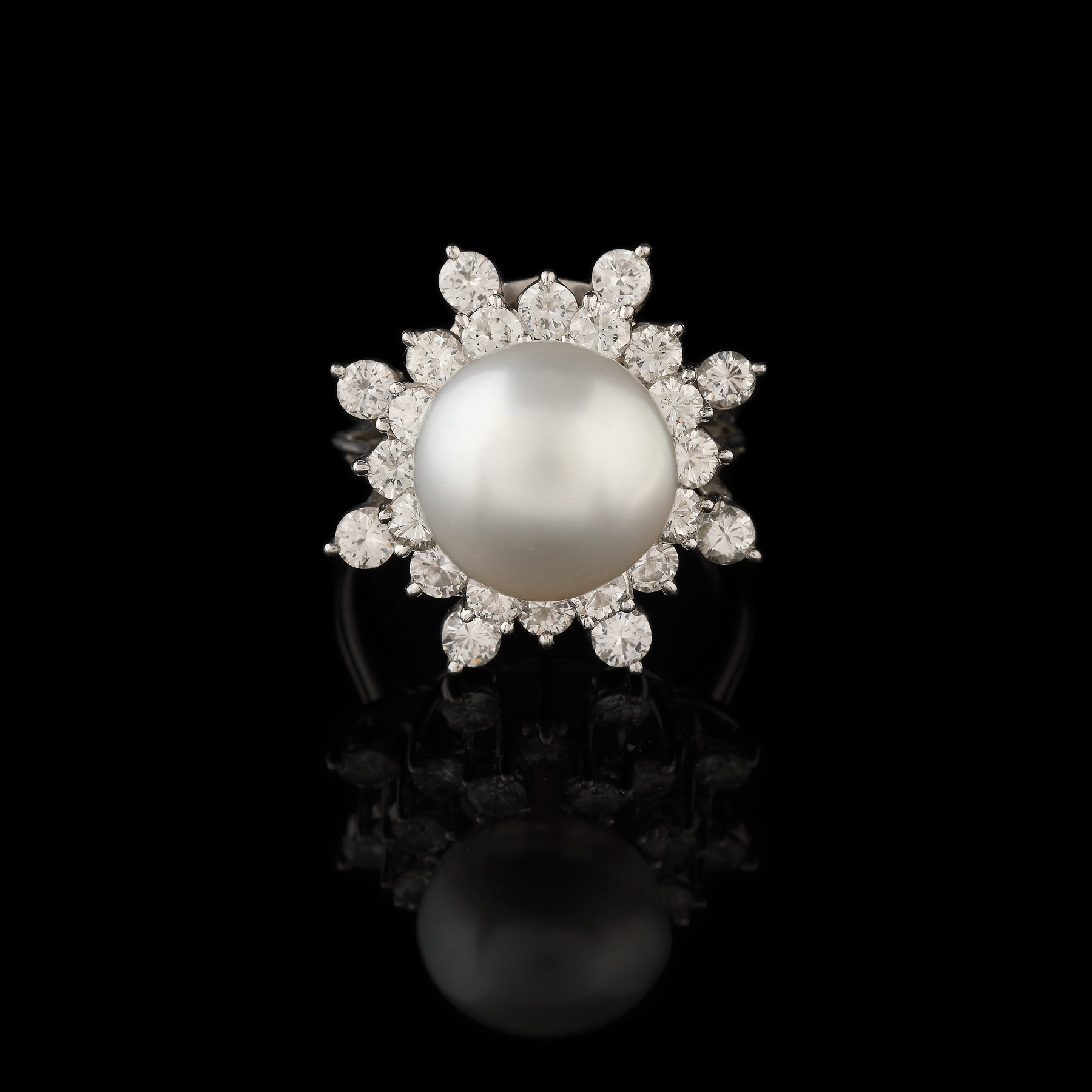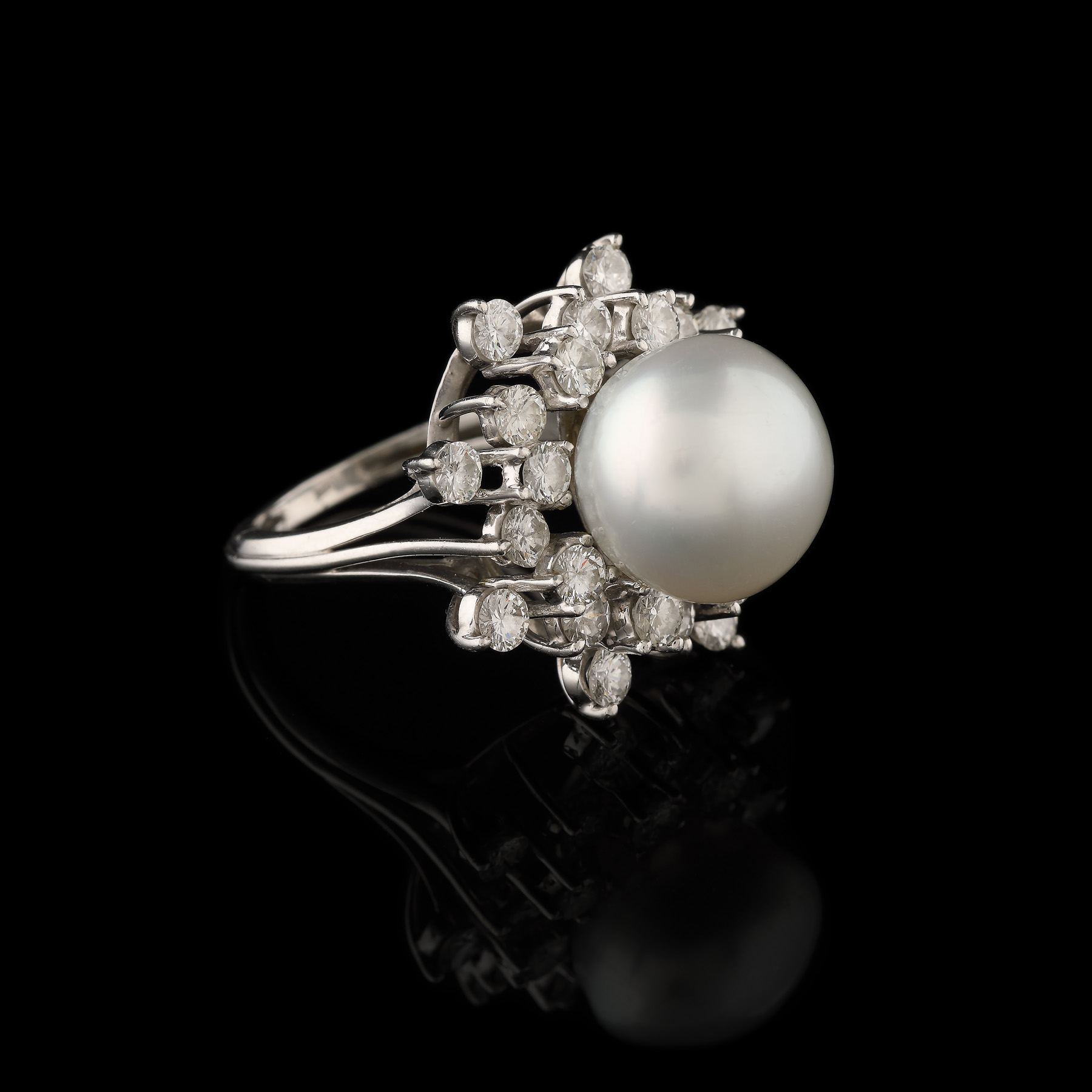1 perlă de cultură South Sea, rotundă, albă, d=12,63-12,84 mm și 24 diamante rotunde briliant, culoare F-G, claritate VS, cca. 2,0 ct.