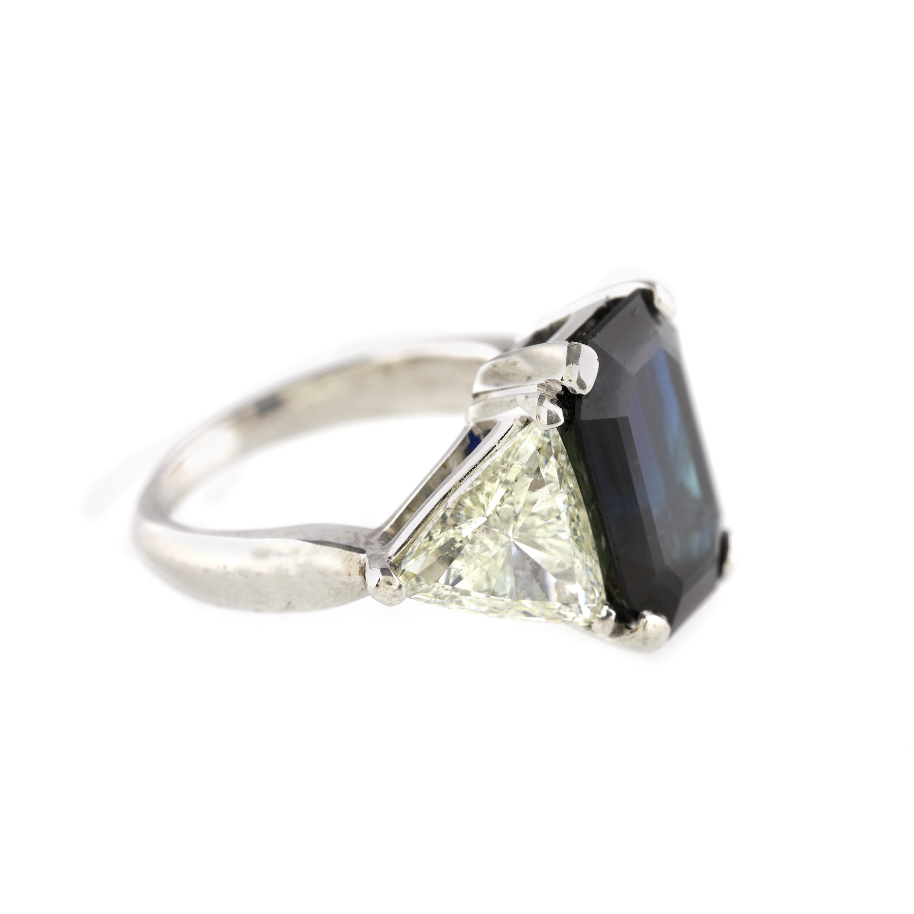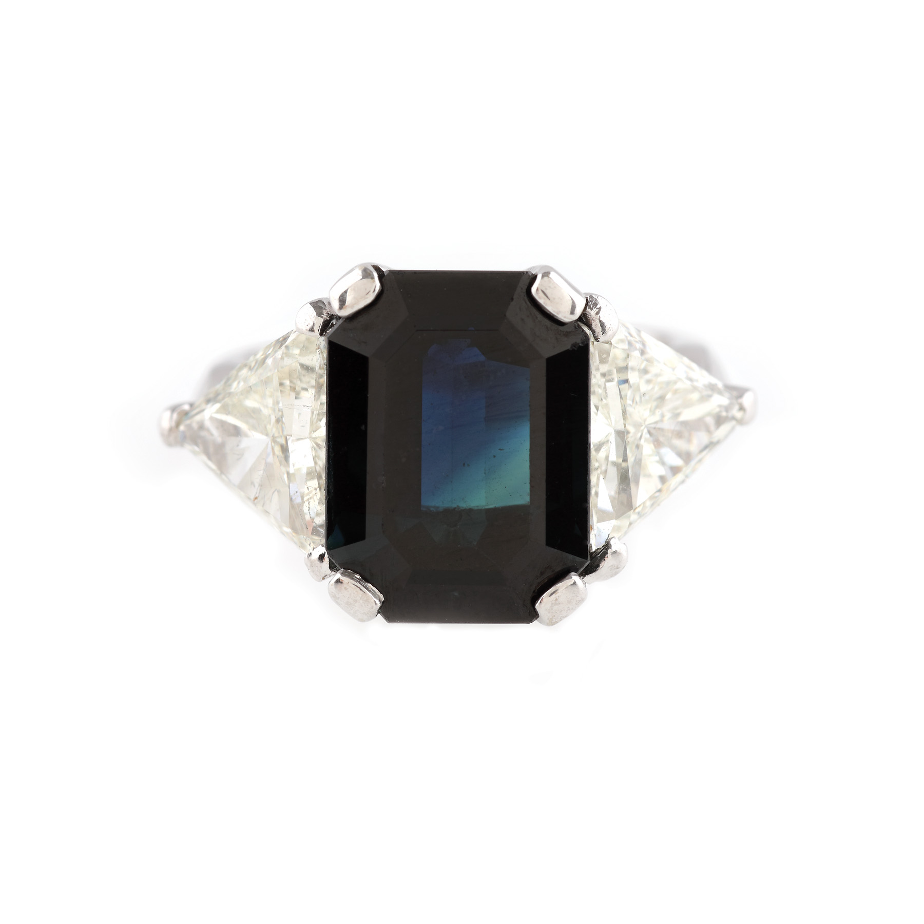 2 diamante triunghiular fațetate, culoare I-J, claritate VS2-SI1, cca. 3 ct. și 1 safir rectangular step cut, culoare albastru, claritate eye-clean, cca. 7,35 ct.