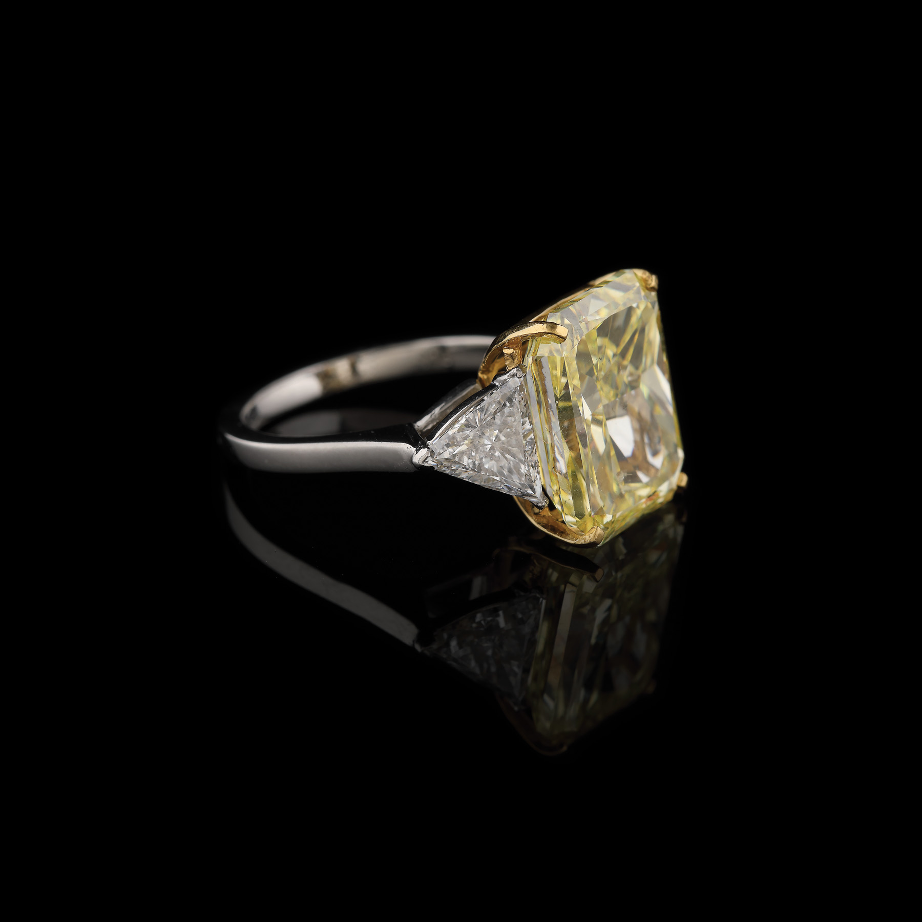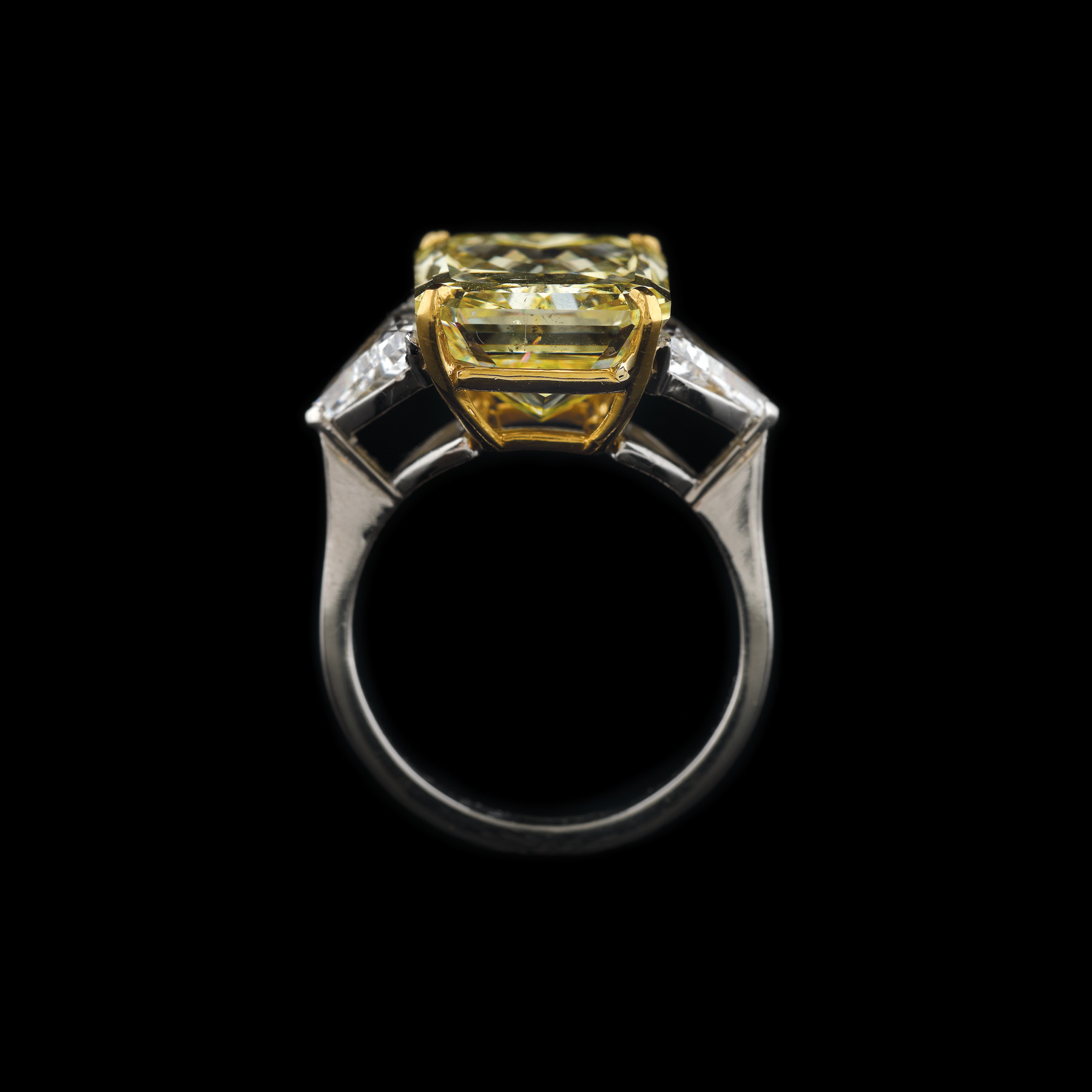 1 diamant rectangular radiant cut, culoare intens galben, cca. 10,33 ct. și 2 diamante triunghiular fațetate, culoare D, claritate VS2-VS1, cca. 0,75 ct. și 0,68 ct. Diamantul galben prezintă tratament pentru îmbunătățirea culorii și clarității.