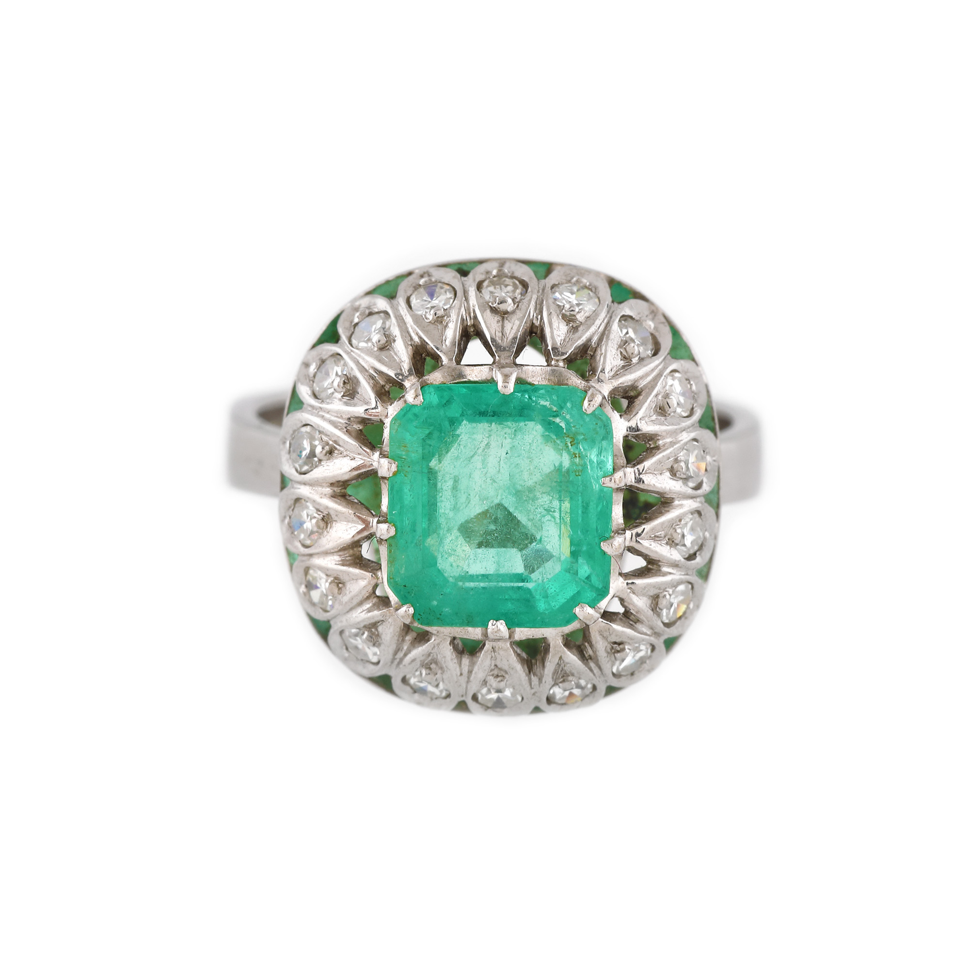 12. Inel din platină, decorat central cu un smarald anturat de diamante