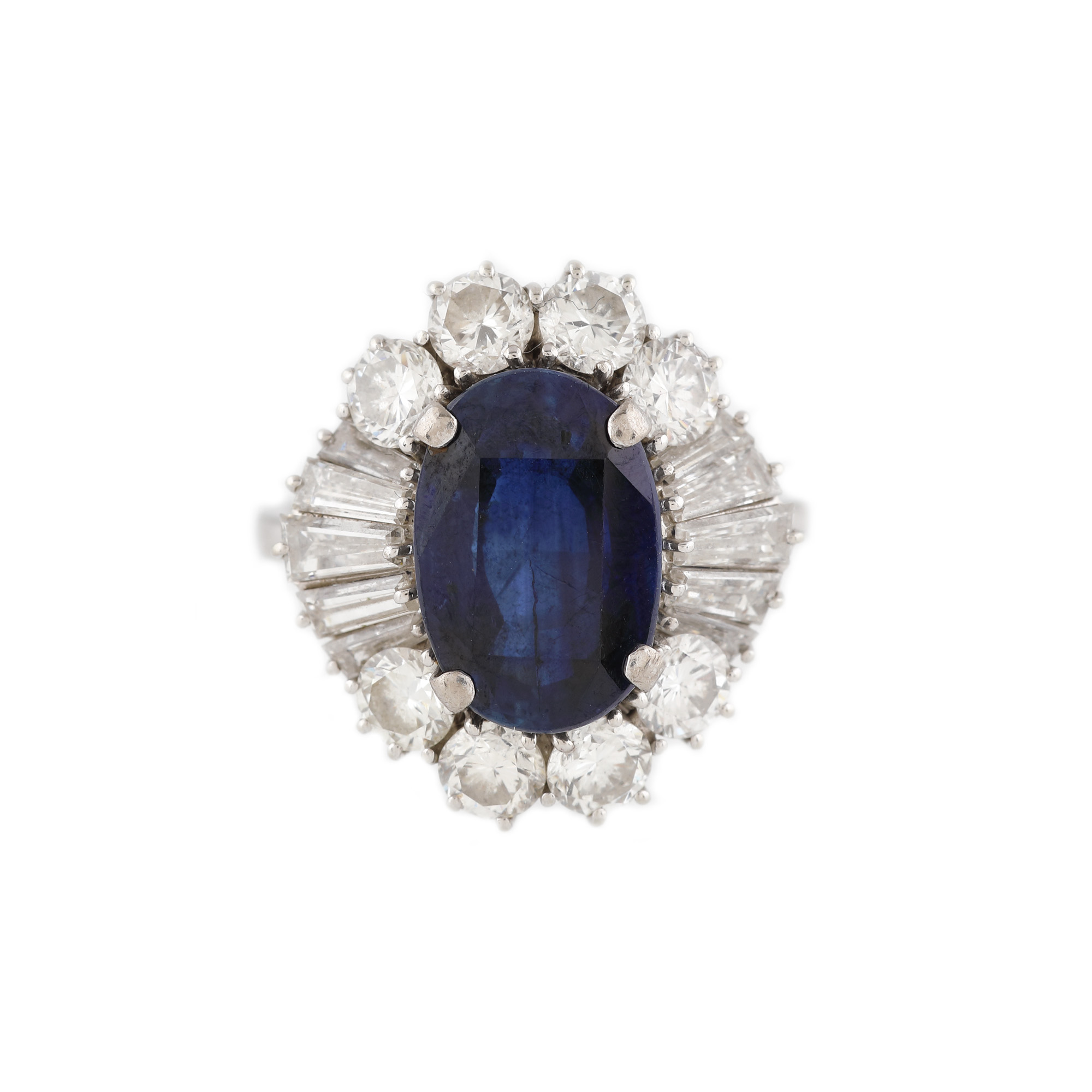 35. Inel din aur alb, decorat central cu safir, anturat de diamante baghete și briliante