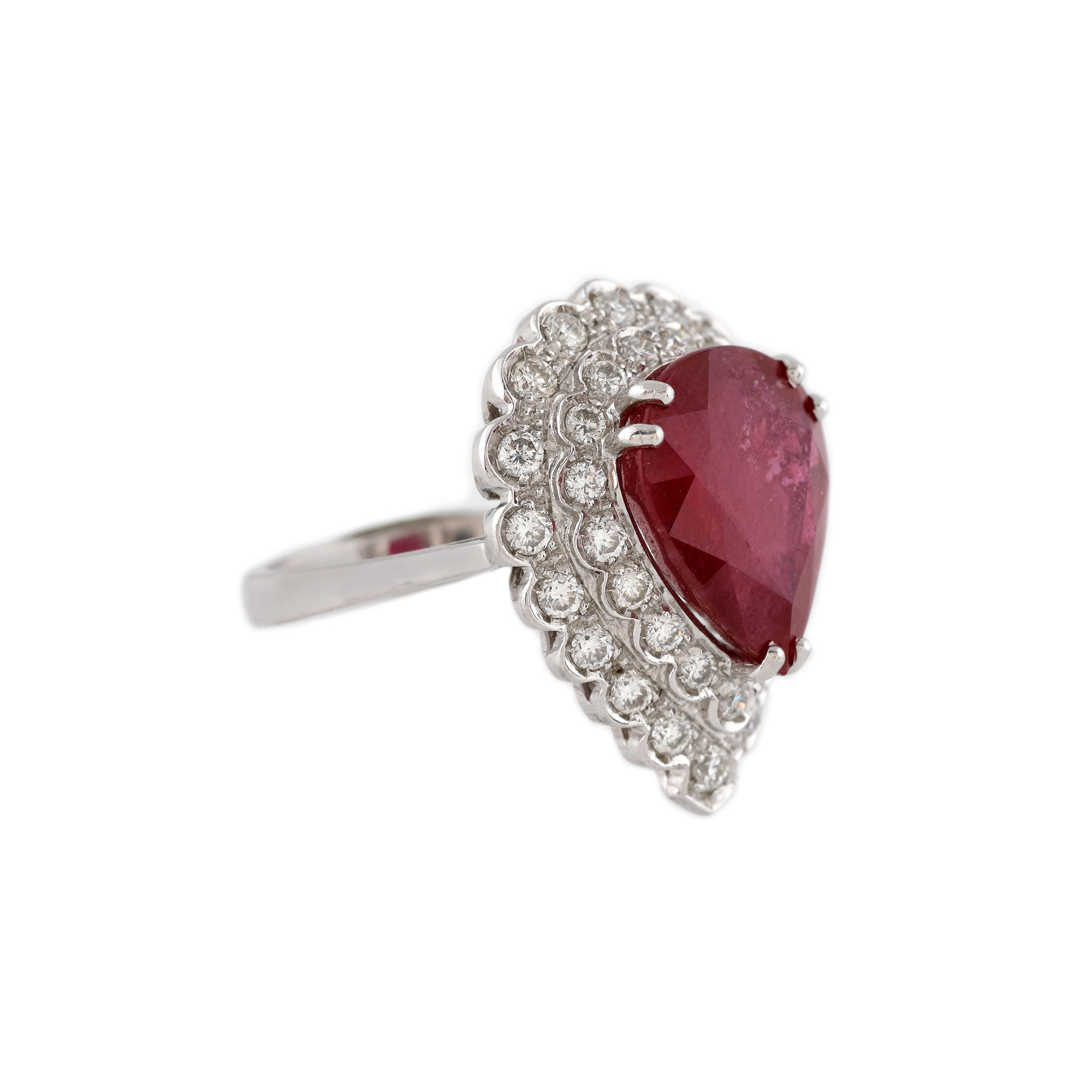 1 rubin fracture filled pară fațetat, culoare roșu, claritate moderately included, cca. 7,9 ct. și 35 diamante rotunde briliant, culoare F-G, claritate VS-SI1, cca. 1,25 ct.