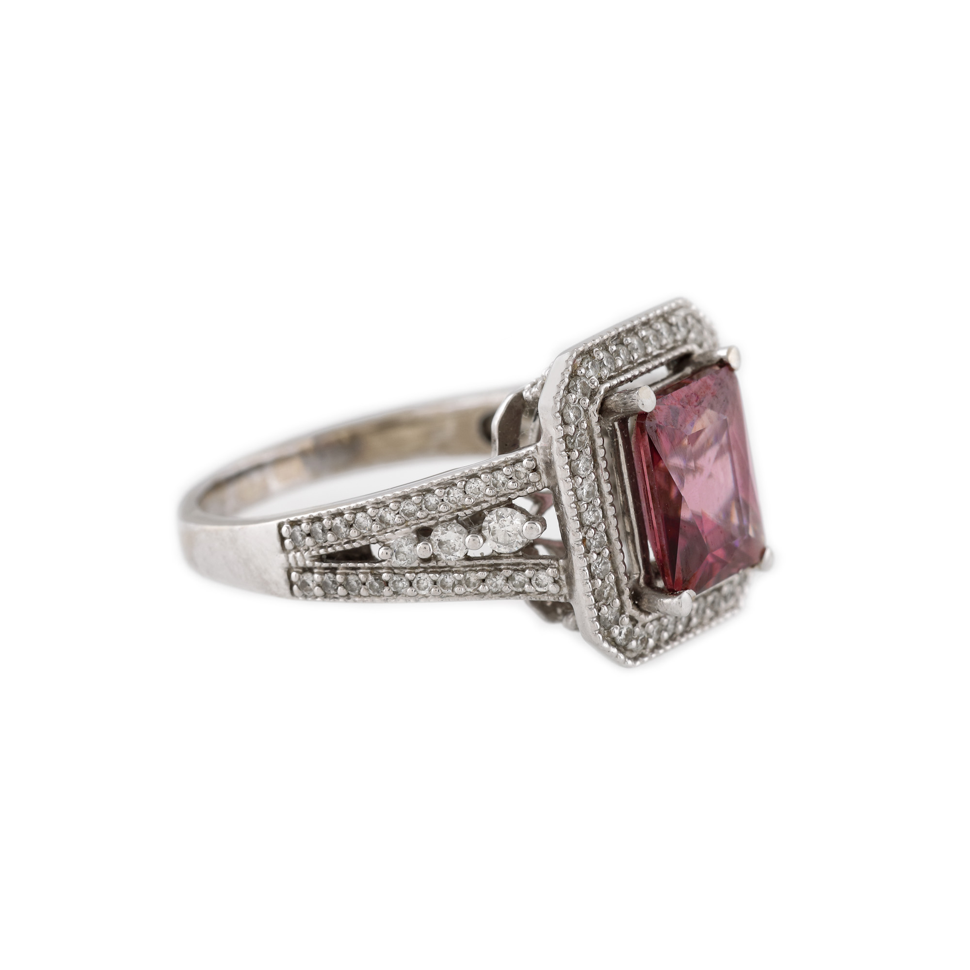 1 zircon natural rectangular fațetate, culoare violet, claritate eye-clean, cca. 3,9 ct. și 86 diamante rotunde briliant, culoare I-J, claritate VS-SI1, cca. 0,64 ct.