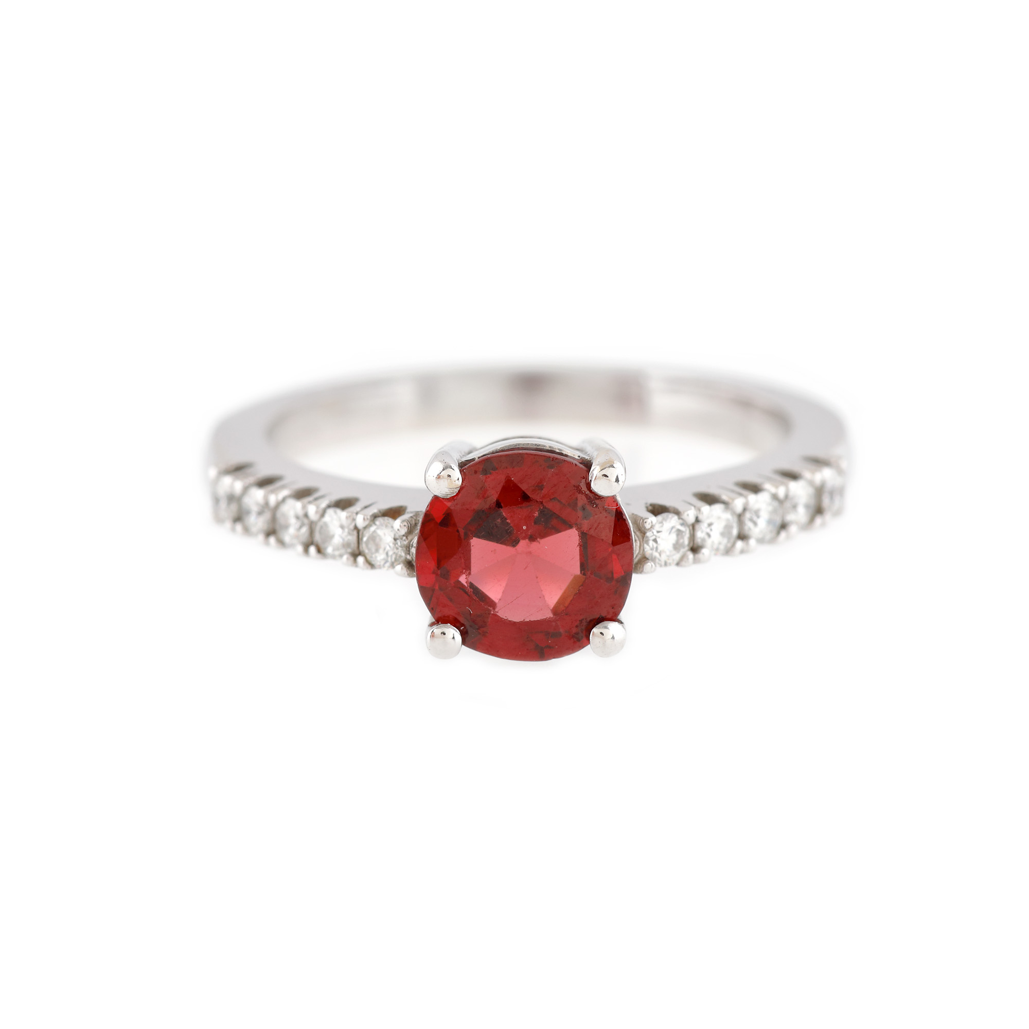 185. Inel din aur alb, decorat central cu granat și diamante alăturate