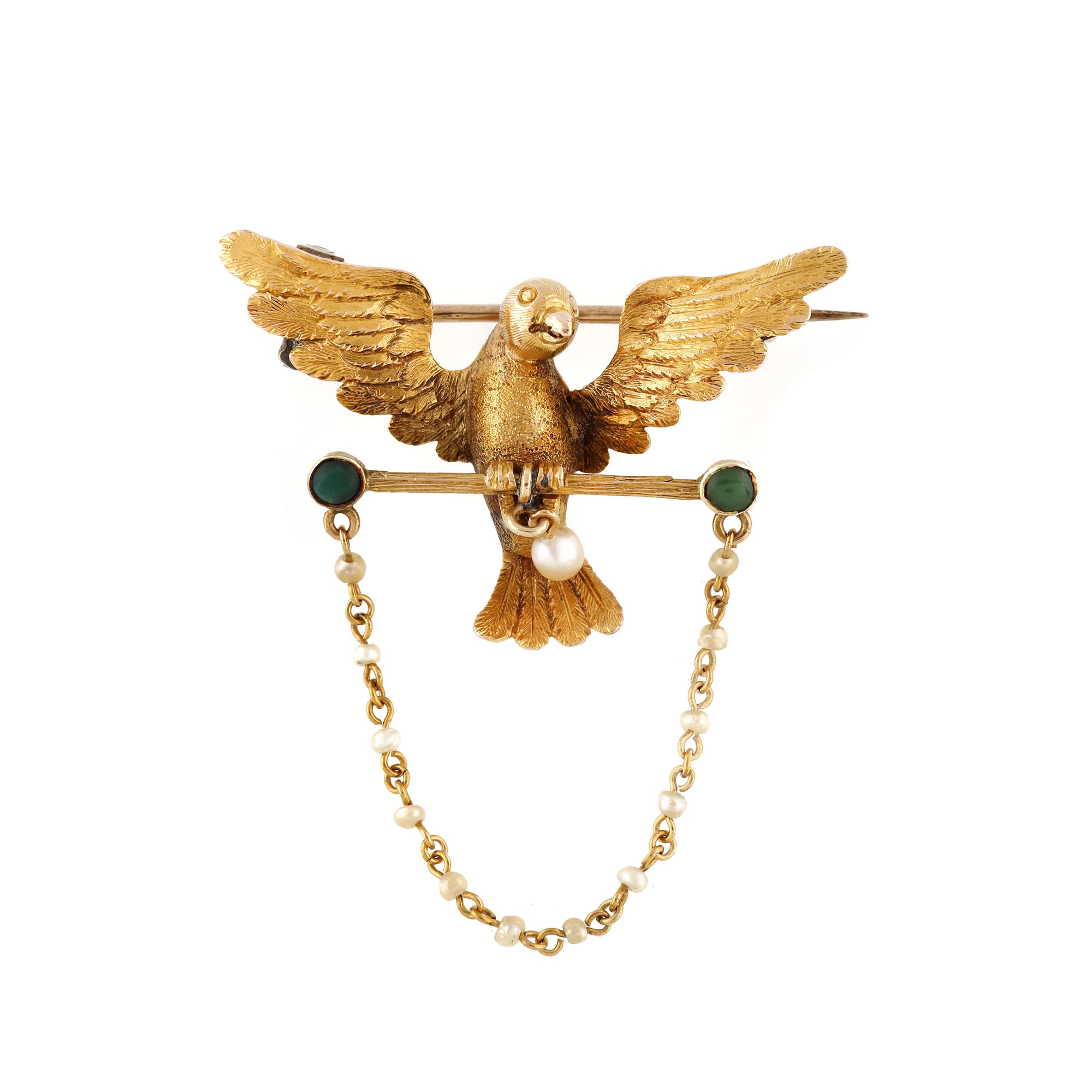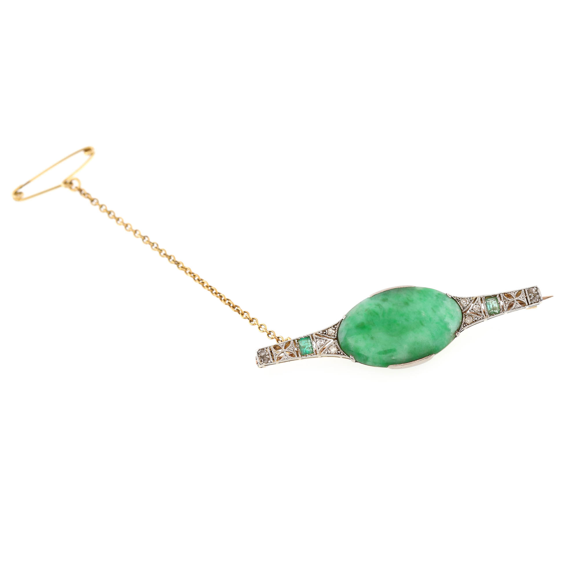 158. Broșă Art Deco din aur și platină, decorată cu jadeit caboșon, smaralde și diamante