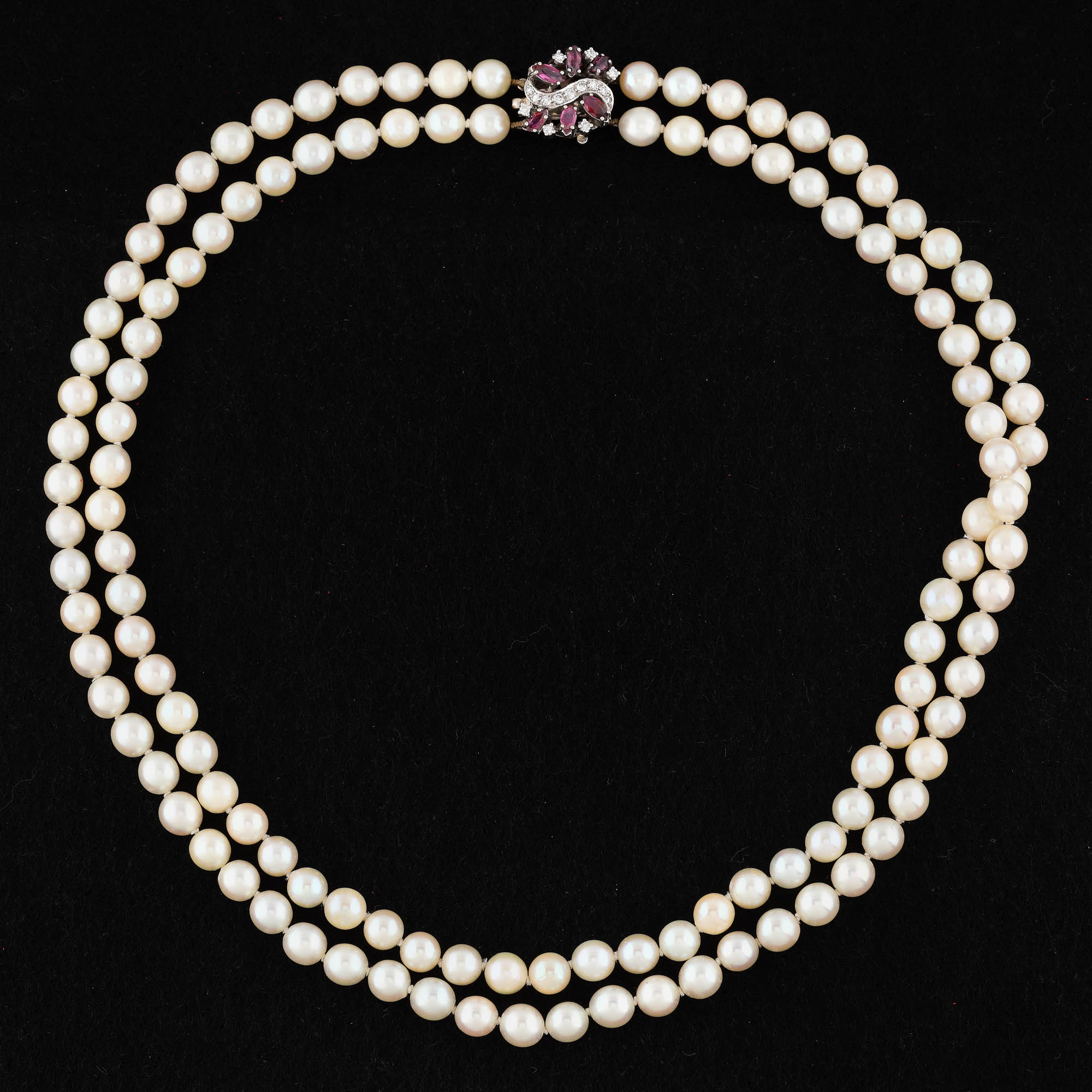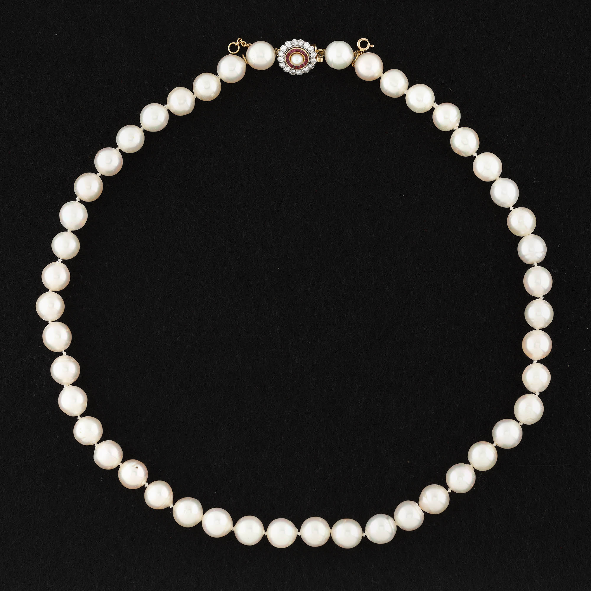 180. Colier din perle, cu închizătoare din aur și platină, decorată cu diamante și rubine
