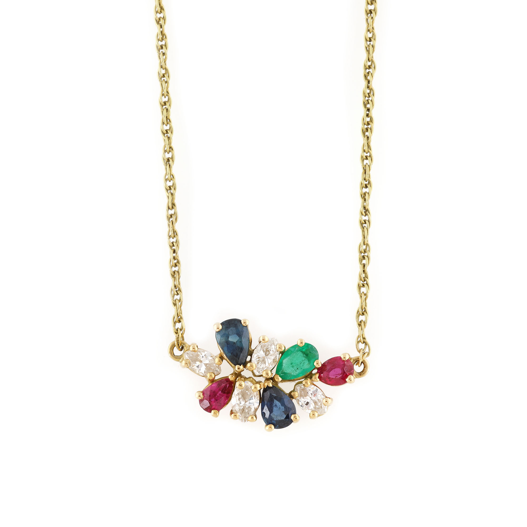 155. Lanț cu pandantiv din aur, decorat cu smarald, rubine, safire și diamante
