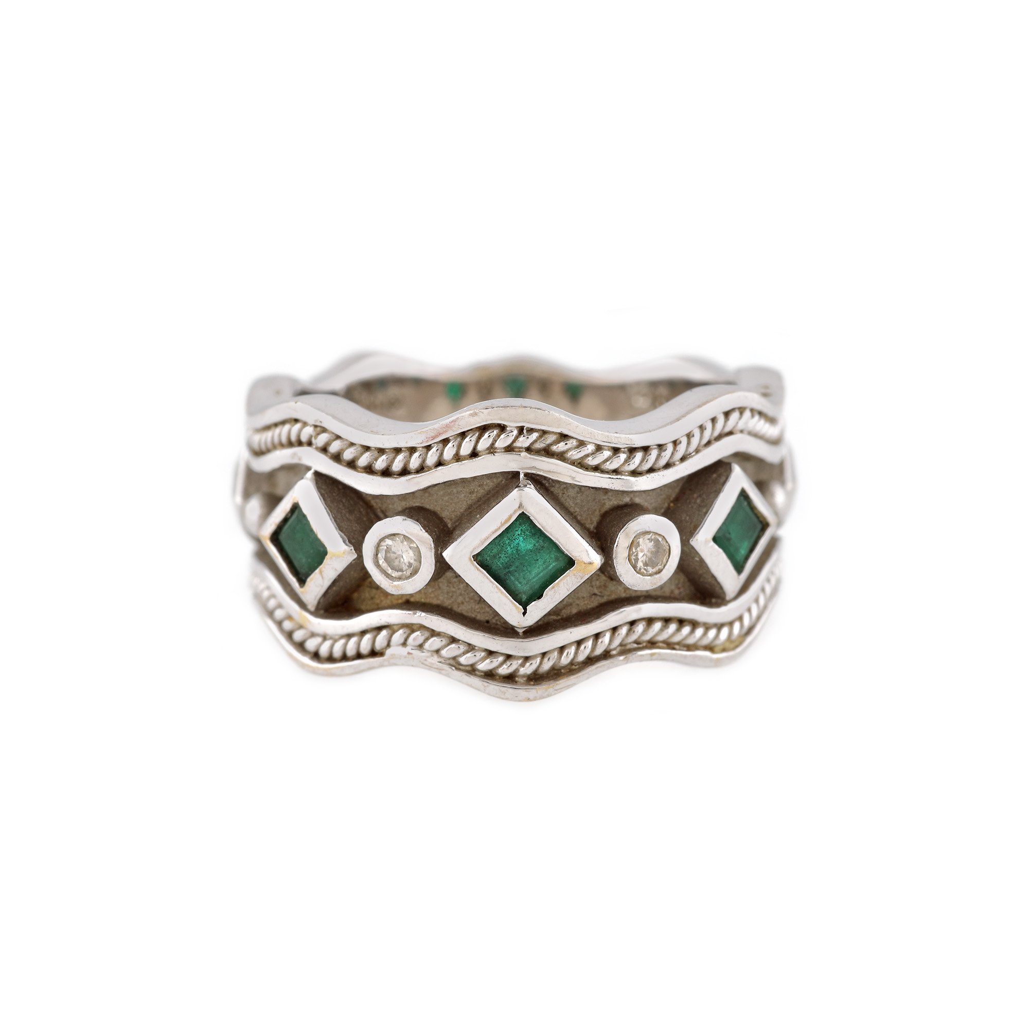 160. Inel din aur alb, în manieră Etruscan Revival, decorat cu smaralde și diamante