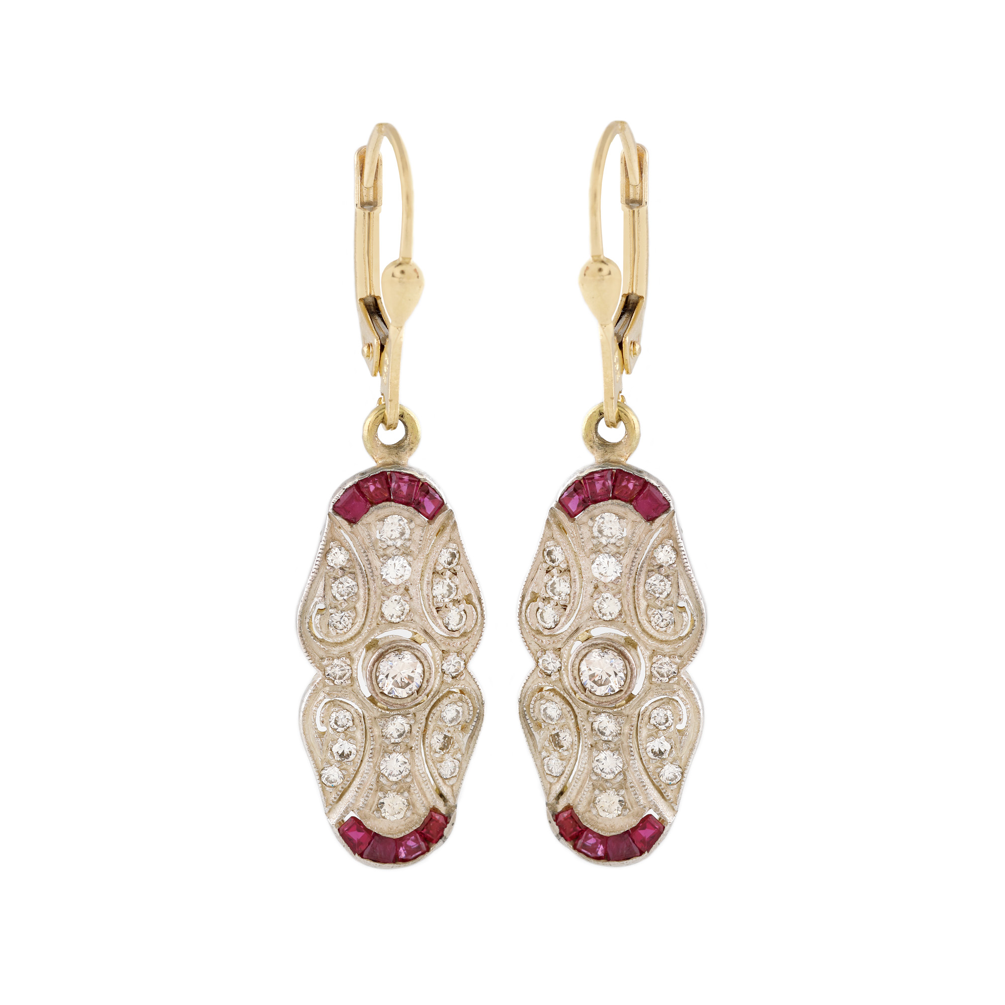 189. Pereche de cercei în manieră edwardiană, decorată cu diamante și rubine