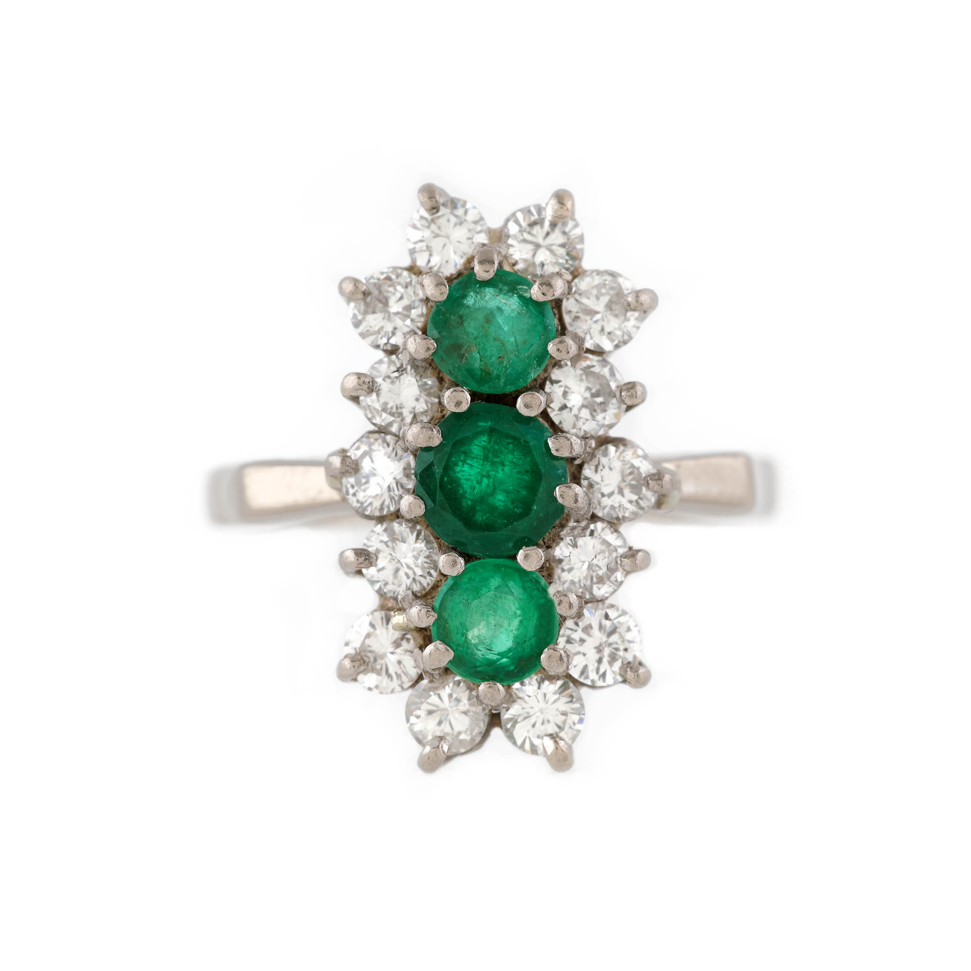 165. Inel din aur alb, ornat cu trei smaralde, în anturaj de diamante