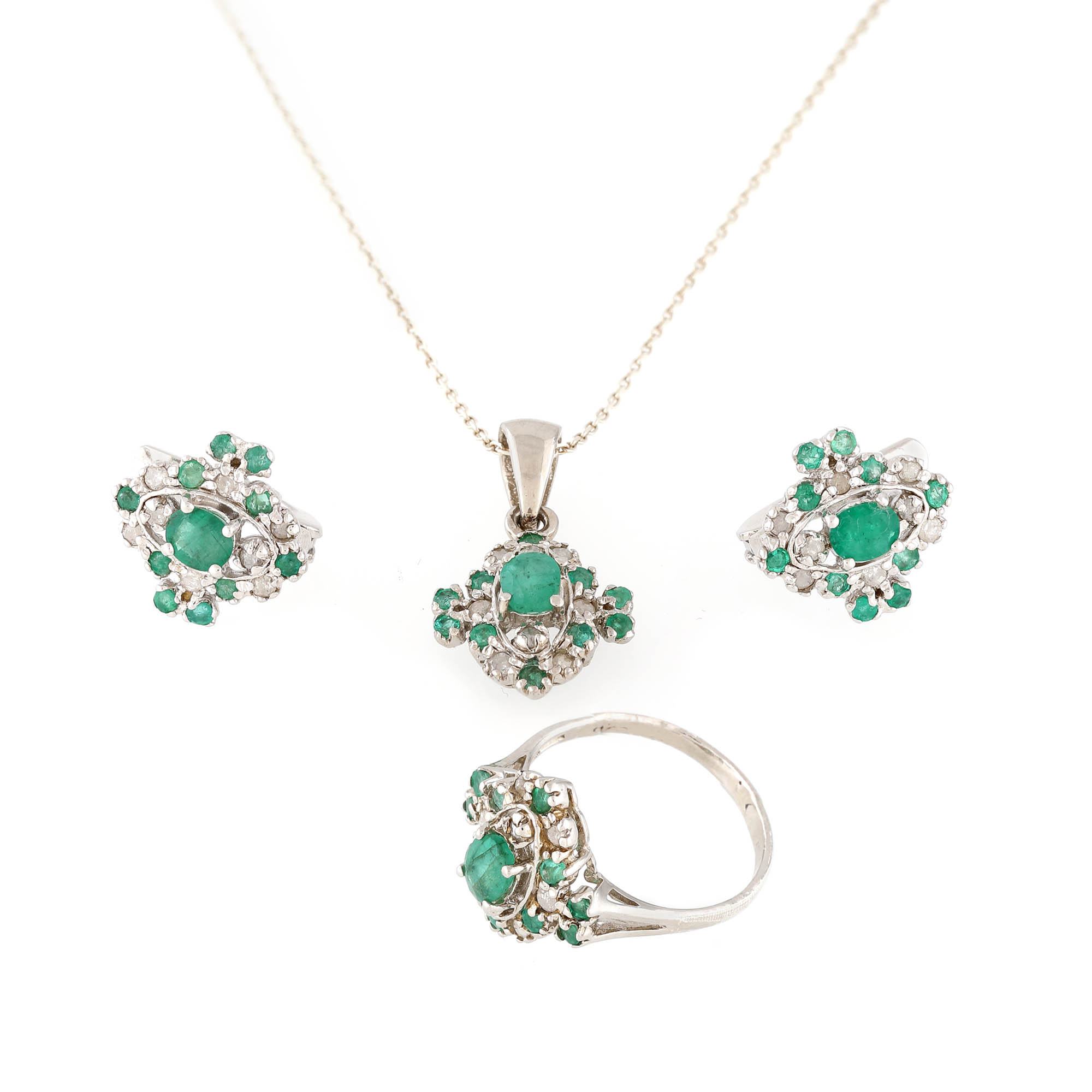 162. Lanț cu pandantiv din aur alb, decorat cu smarald central și diamante