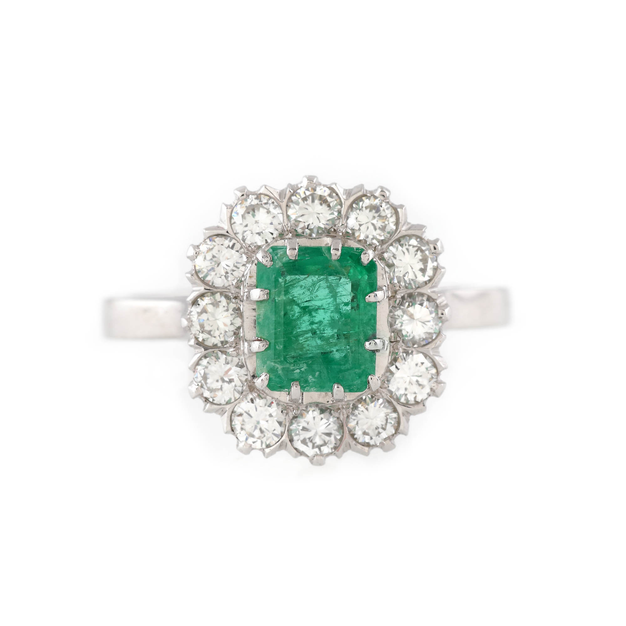 164. Inel din aur alb, decorat central cu un smarald, anturat de diamante