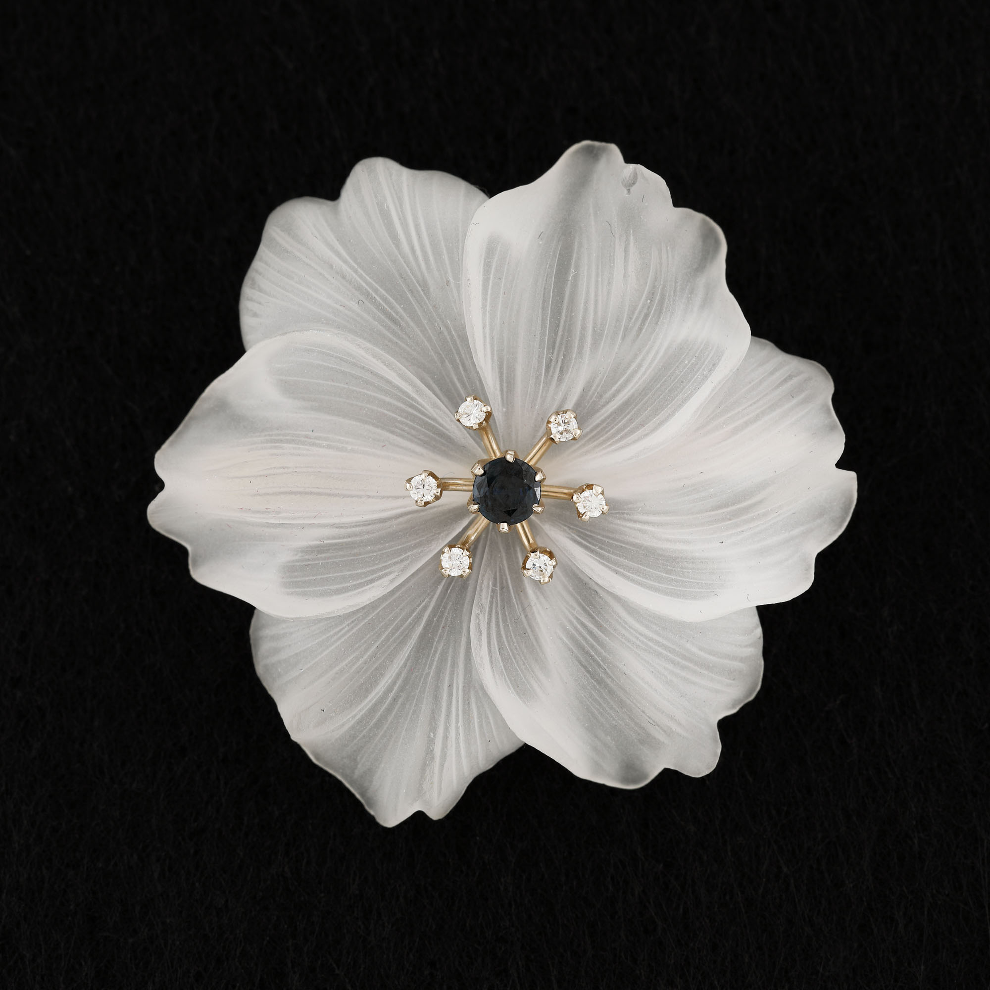 191. Broșă din aur alb, în forma unei flori din cuarț sculptat, ornată central cu safir și diamante