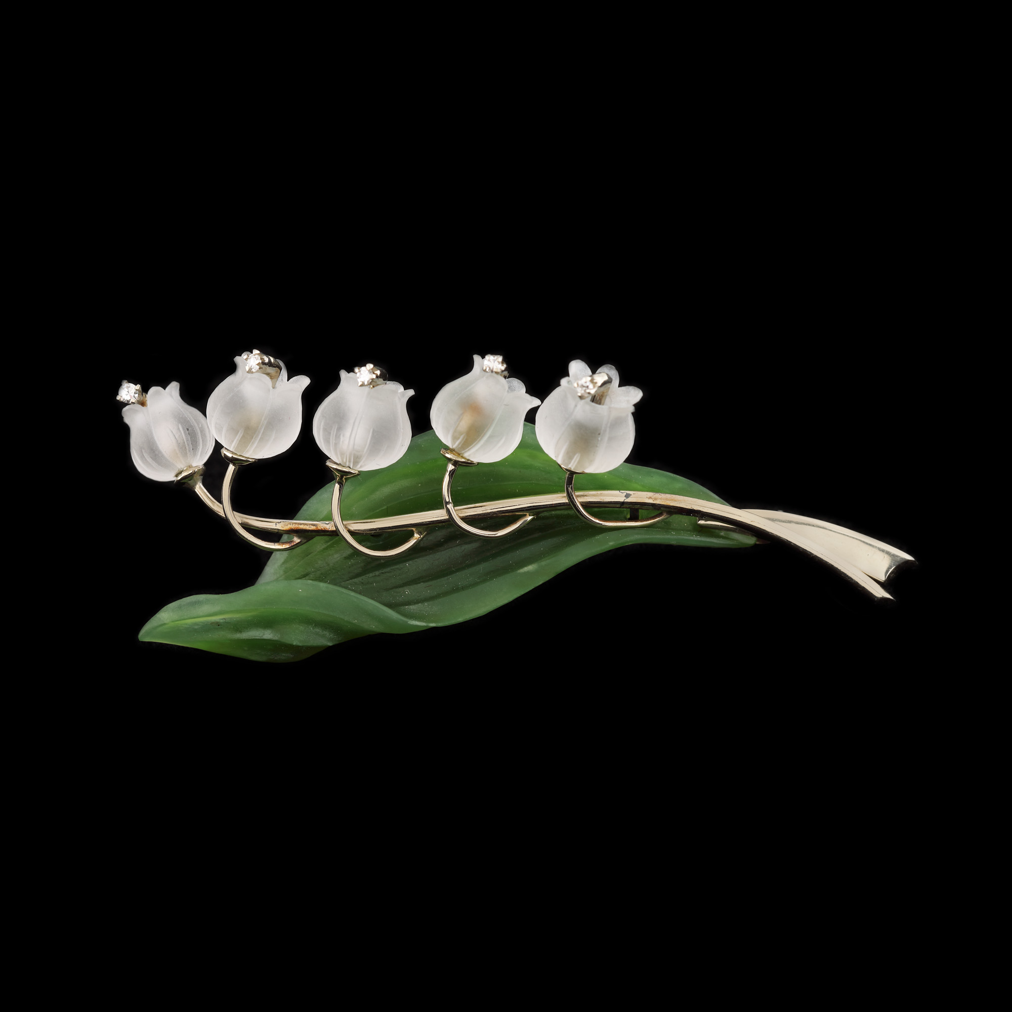 201. Broșă din aur alb, în forma unei lăcrămioare, decorată cu diamante, nefrit și cuarț de stâncă