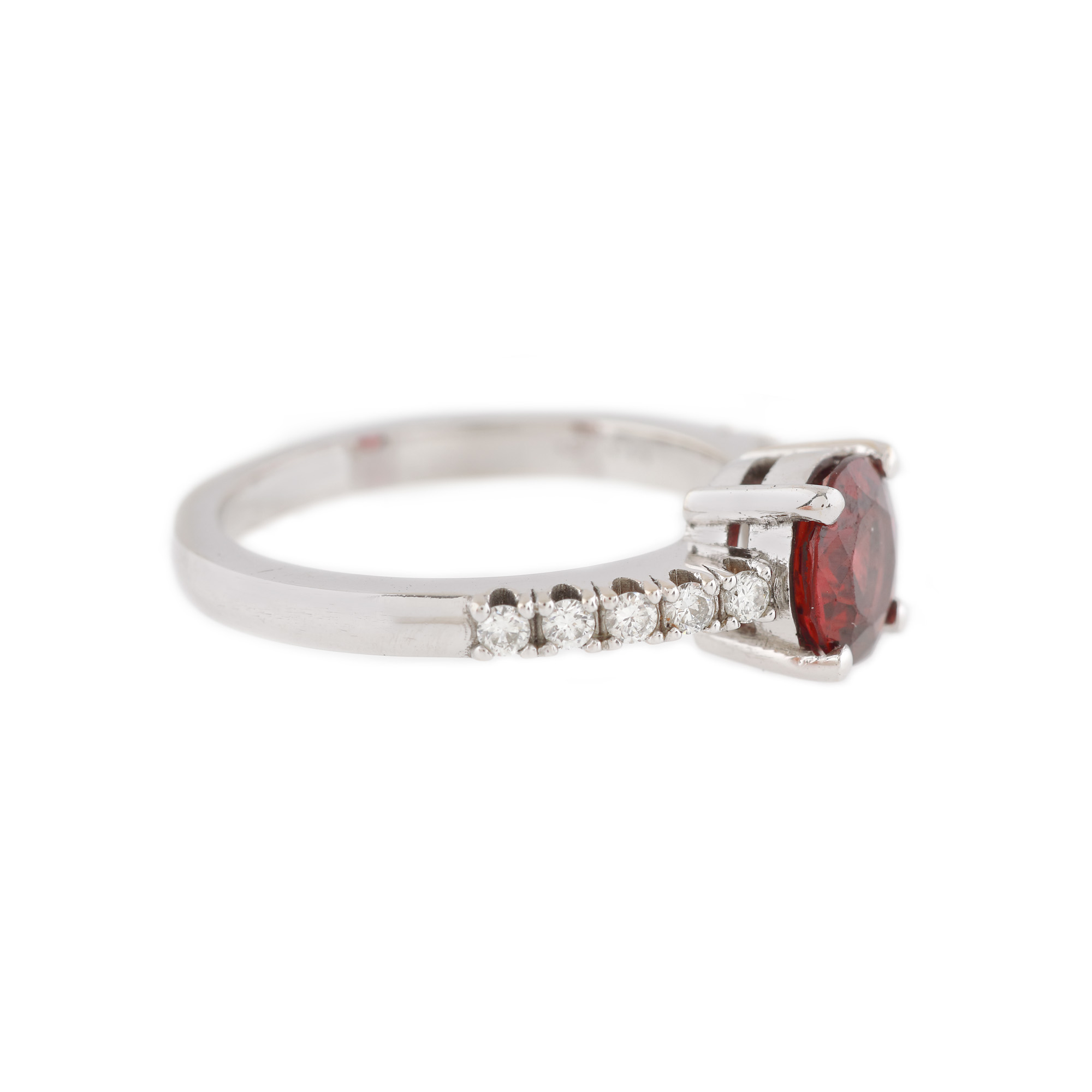 185. Inel din aur alb, decorat central cu granat și diamante alăturate
