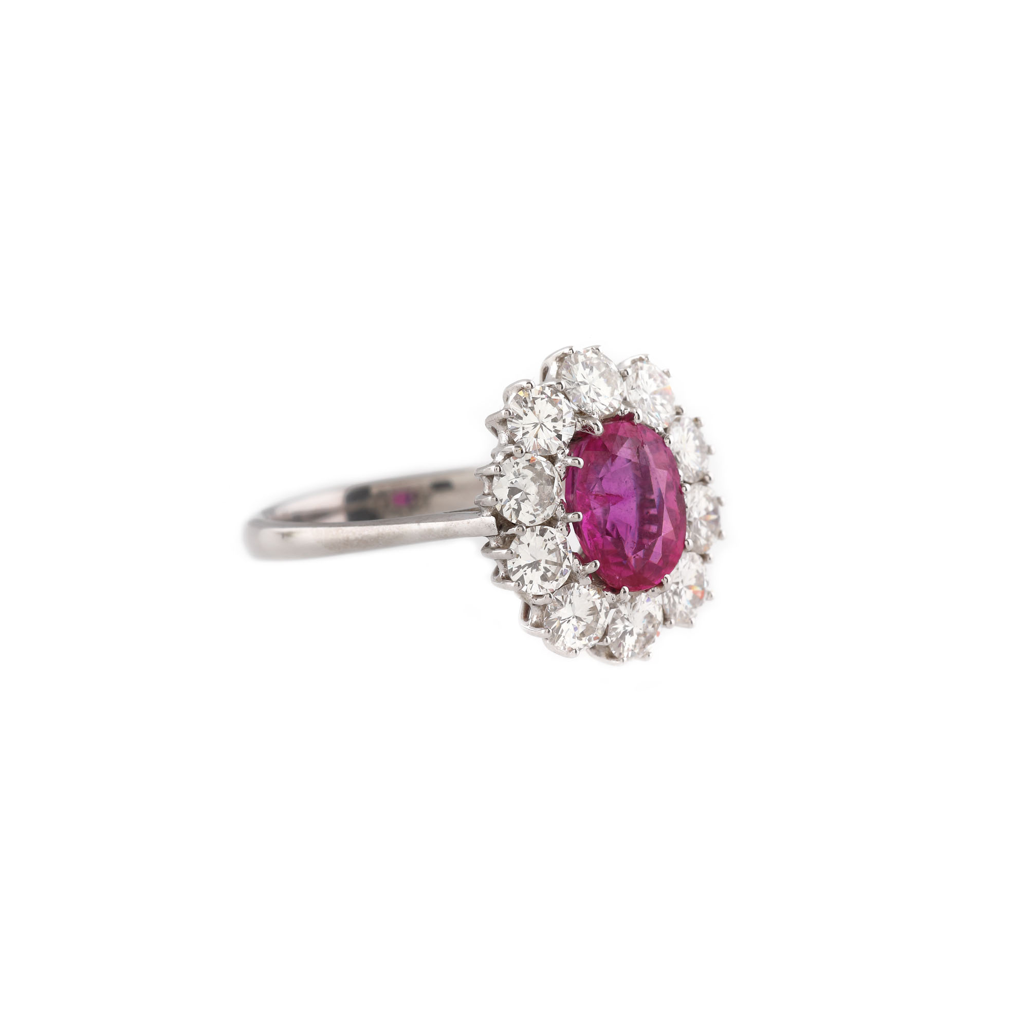 1 safir oval fațetat, culoare roz, claritate SI, cca. 1,7 ct. și 10 diamante rotunde briliant, culoare G-H, claritate VS2-SI1, cca. 1,7 ct.