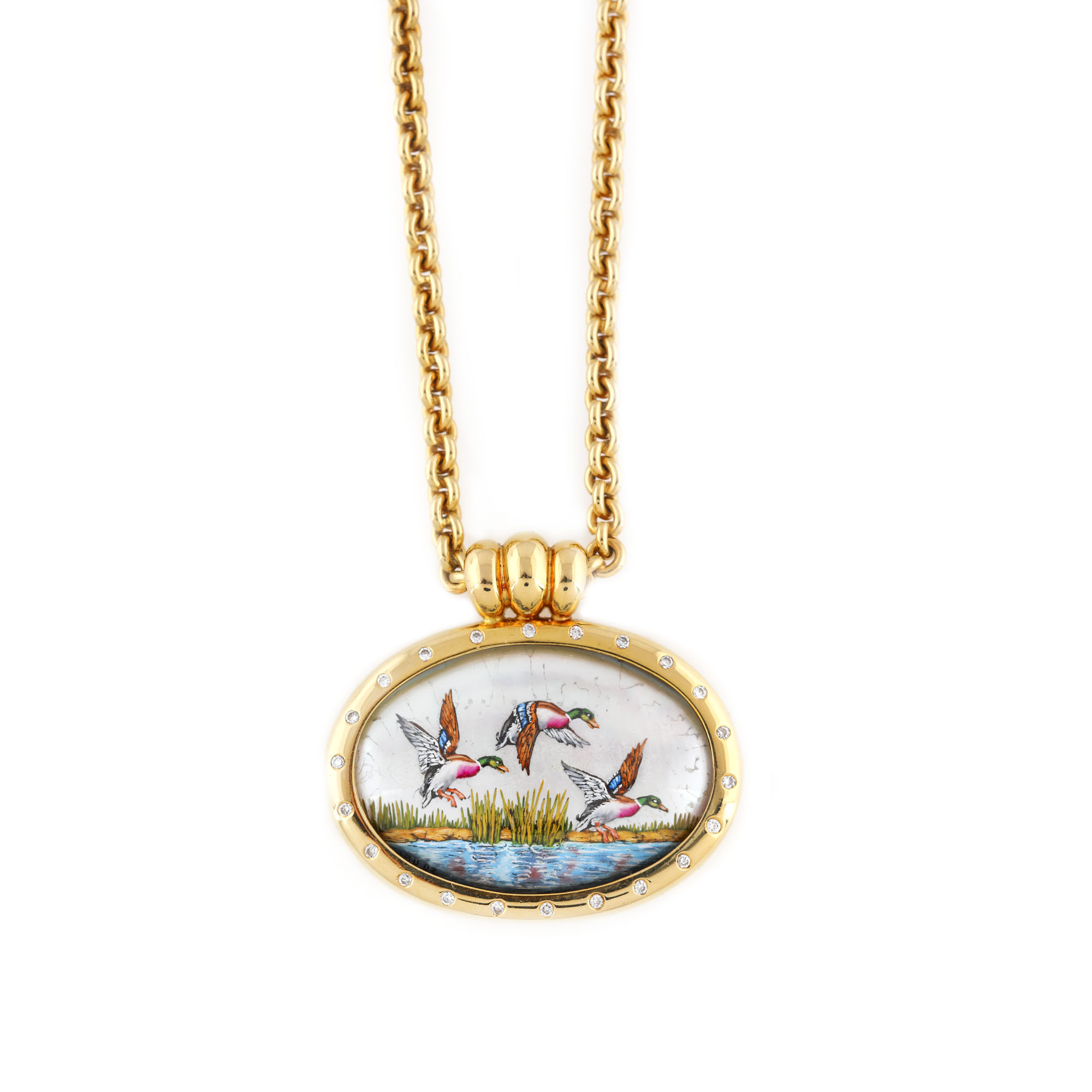 198. Lanț cu pandantiv din aur, ornat cu peisaj pictat pe sidef, decorat cu diamante