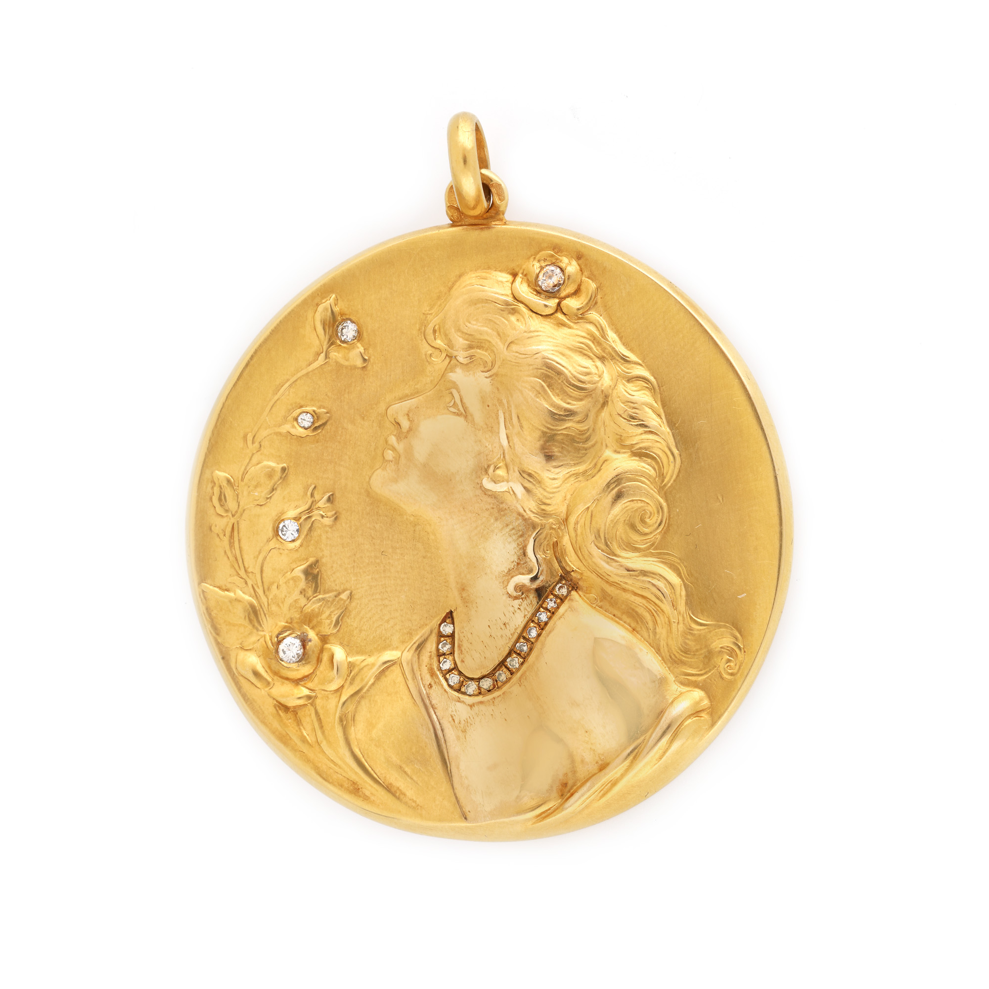 194. Pandantiv din aur în manieră Art Nouveau, design J. Kieback, cu profil de muză în relief și diamante