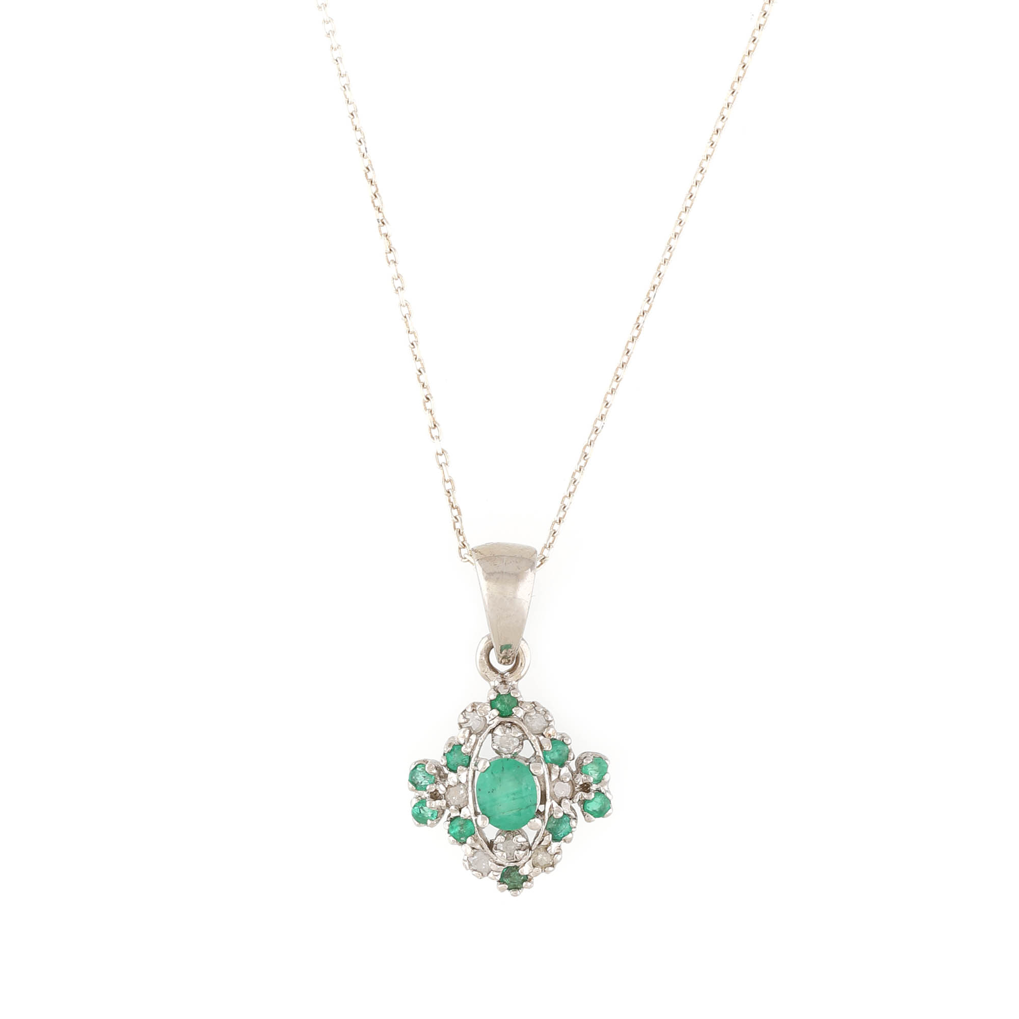 163. Set din argint, compus din inel, lanț cu pandantiv și pereche de cercei, decorat cu smaralde și diamante