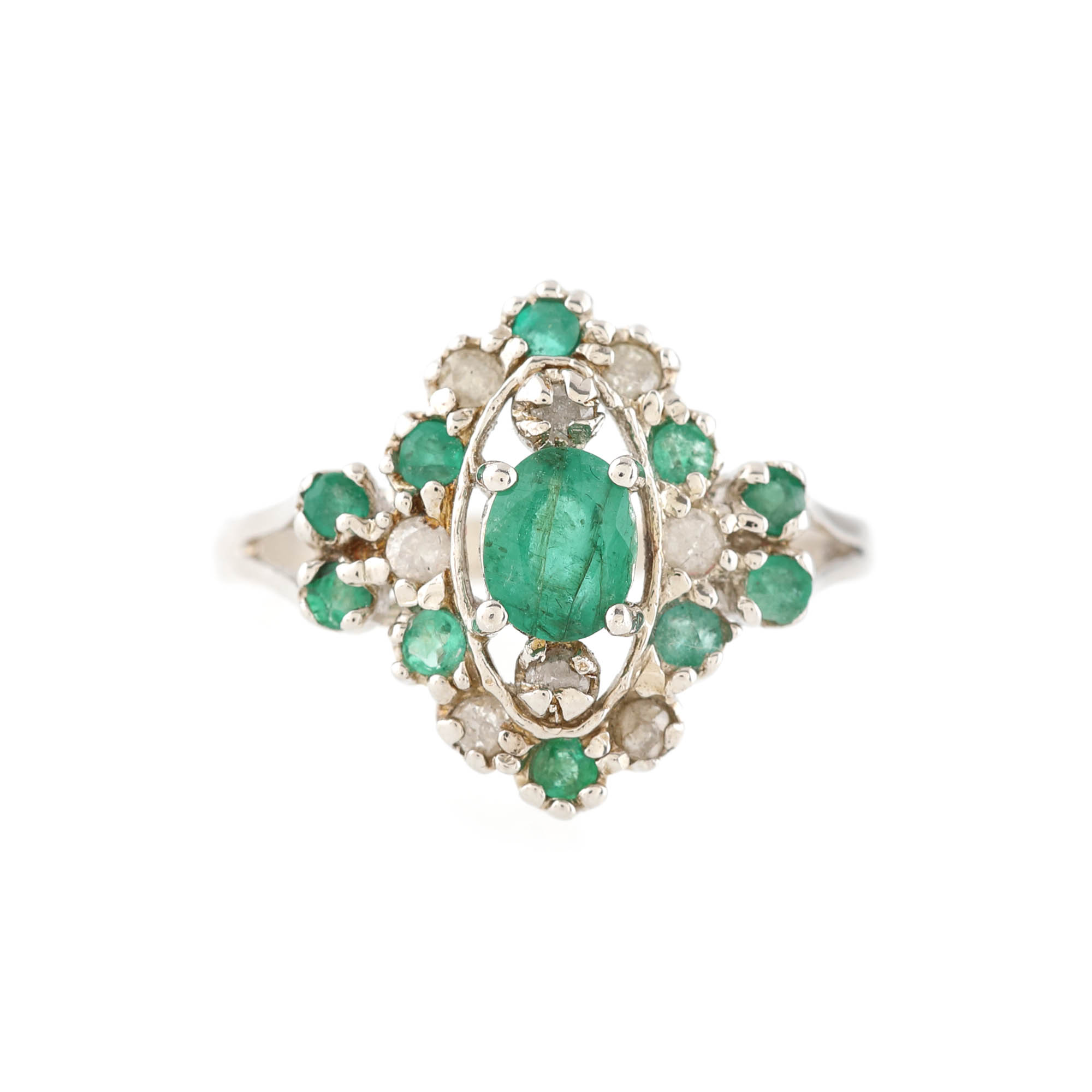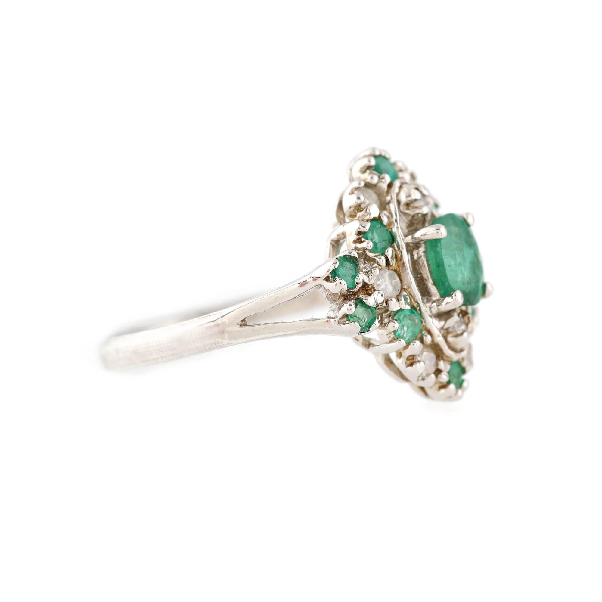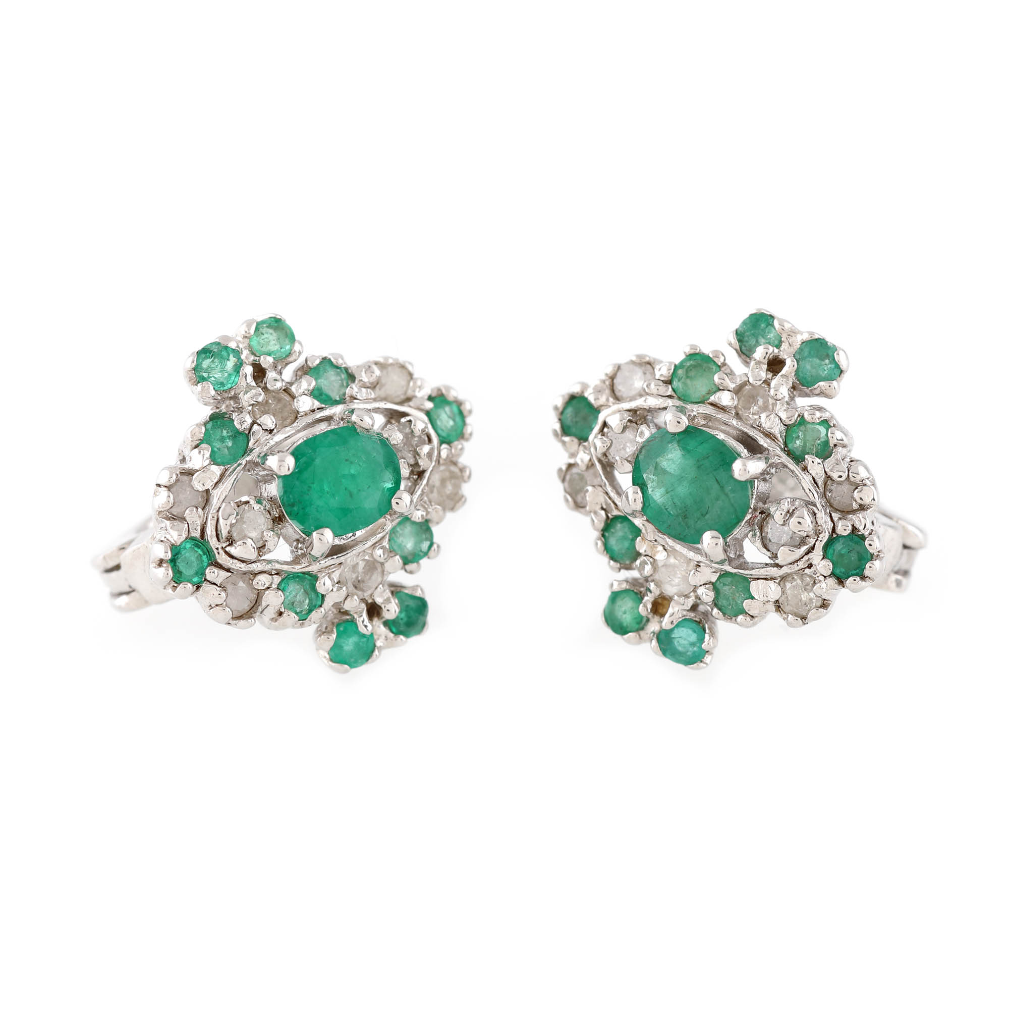 44 smaralde (4 oval fațetate, 40 rotund fațetate), culoare verde, claritate moderately included, cca. 1,25 ct. și 32 diamante (rose cute, rotunde briliant, single cut), culoare J-L, claritate I2-I3, cca. 0,48 ct.