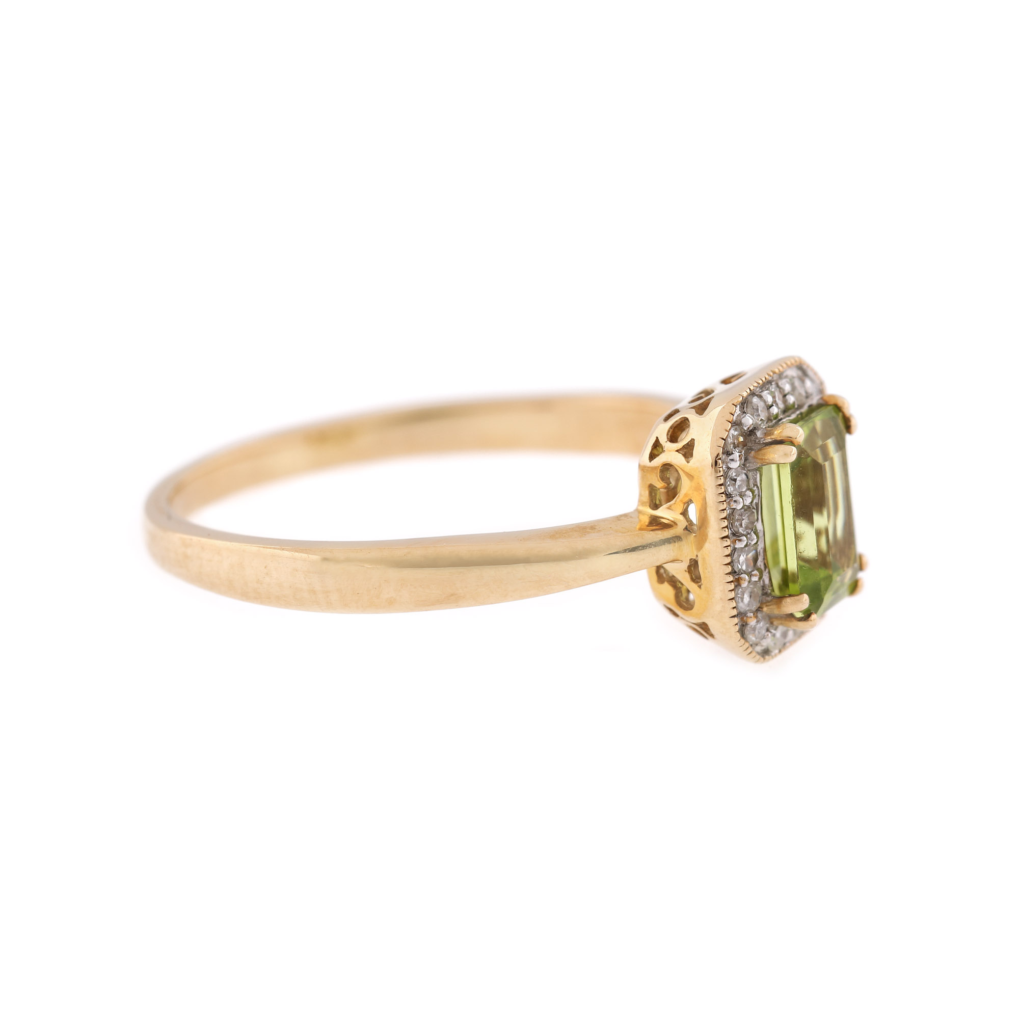 1 peridot emerald cut, culoare verde, claritate eye-clean, cca. 0,6 ct. și 18 diamante single cut, culoare I-K, claritate SI2-I1, cca. 0,11 ct.