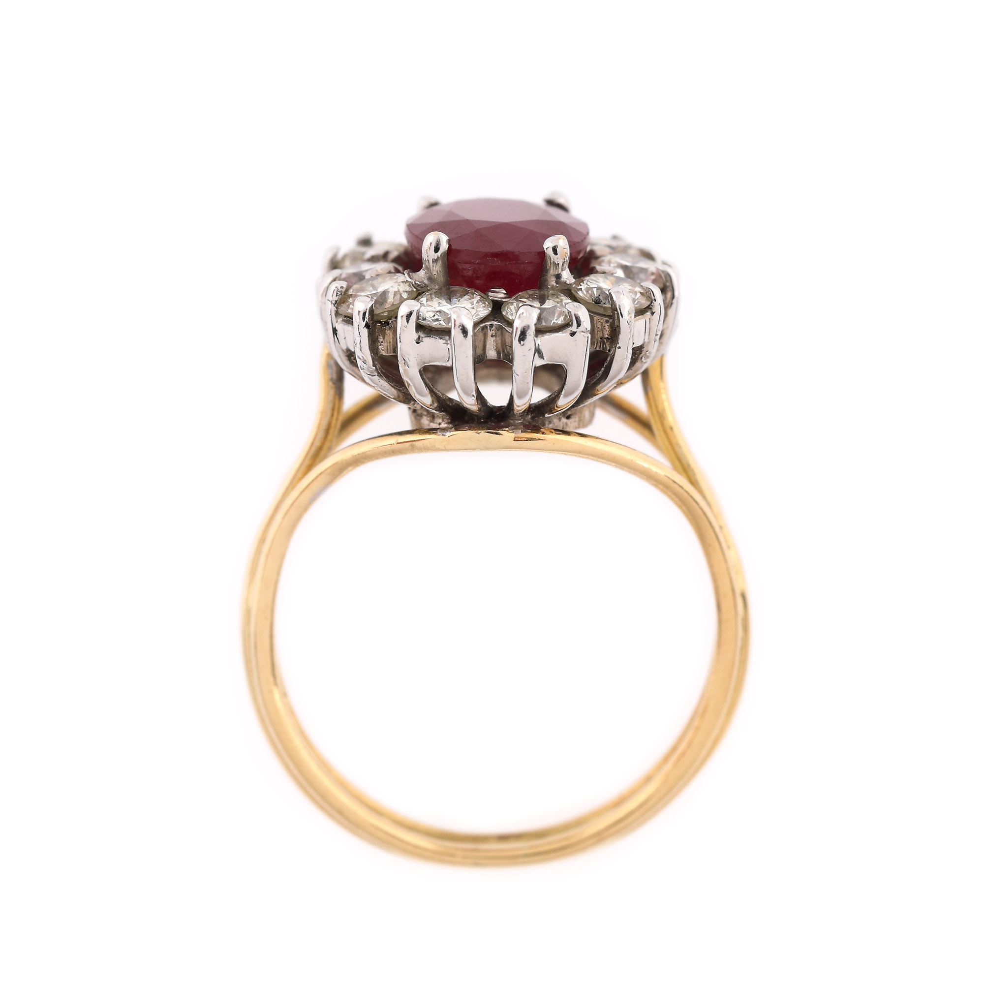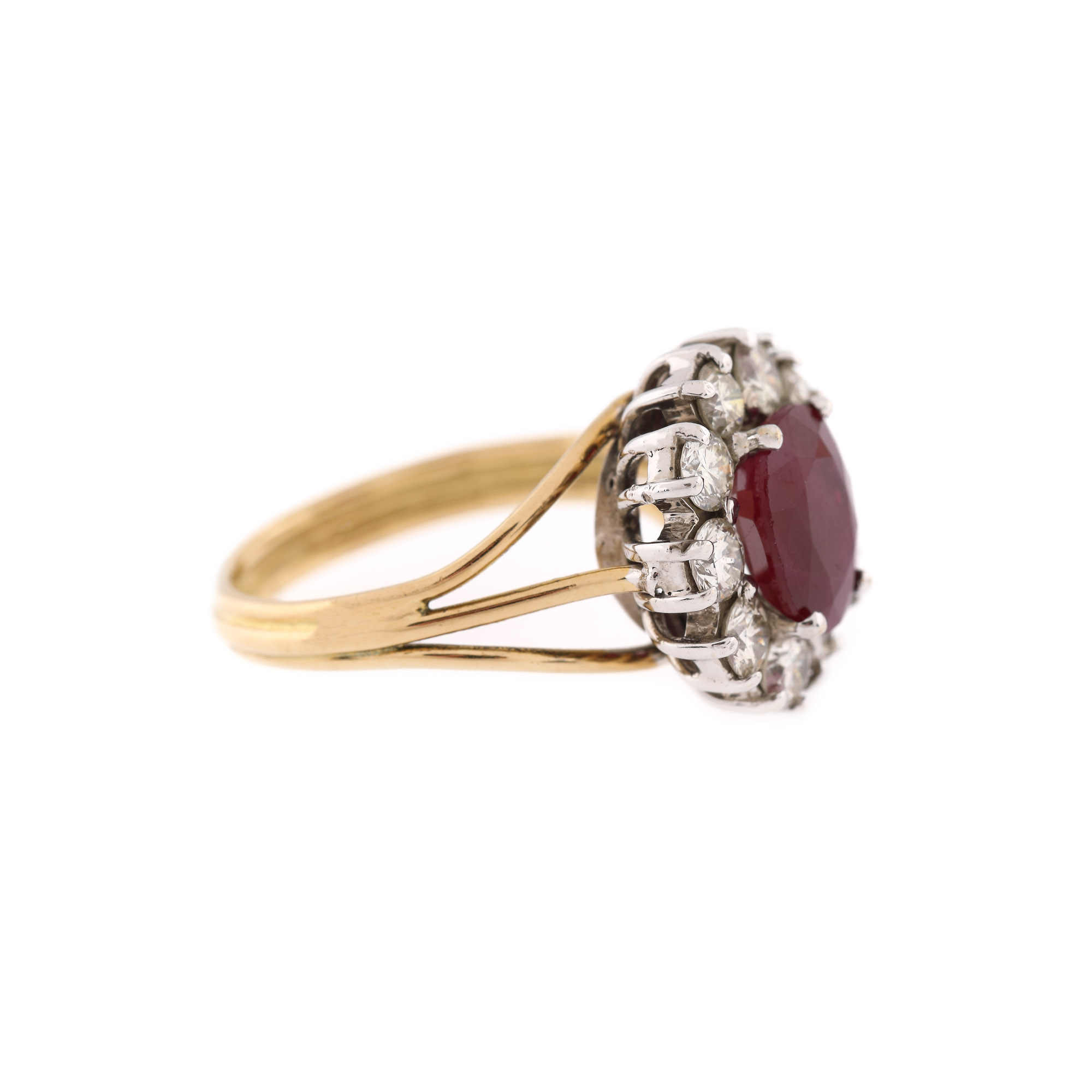 1 rubin oval fațetat, culoare roșu, claritate moderately included, cca. 2,25 ct. și 10 diamante rotunde briliant, culoare J-K, claritate VS2-I1, cca. 1 ct.