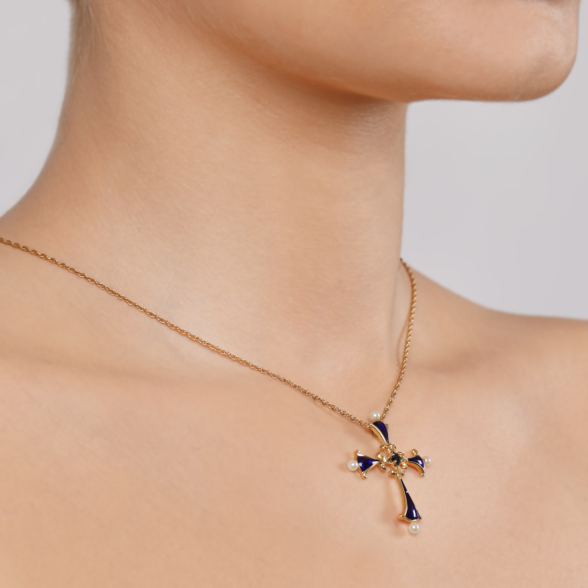 26. Lanț cu pandantiv Igor Carl Fabergé din aur, decorat cu email, un safir, perle și diamante