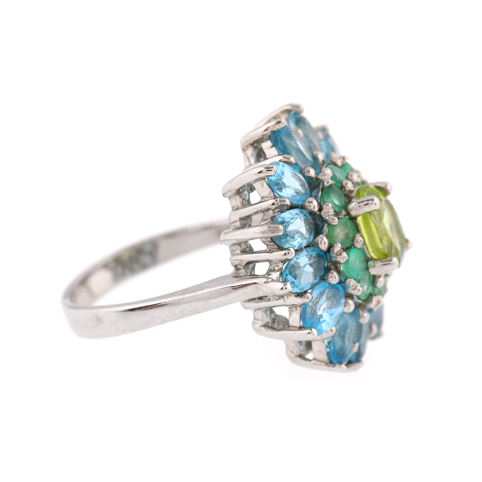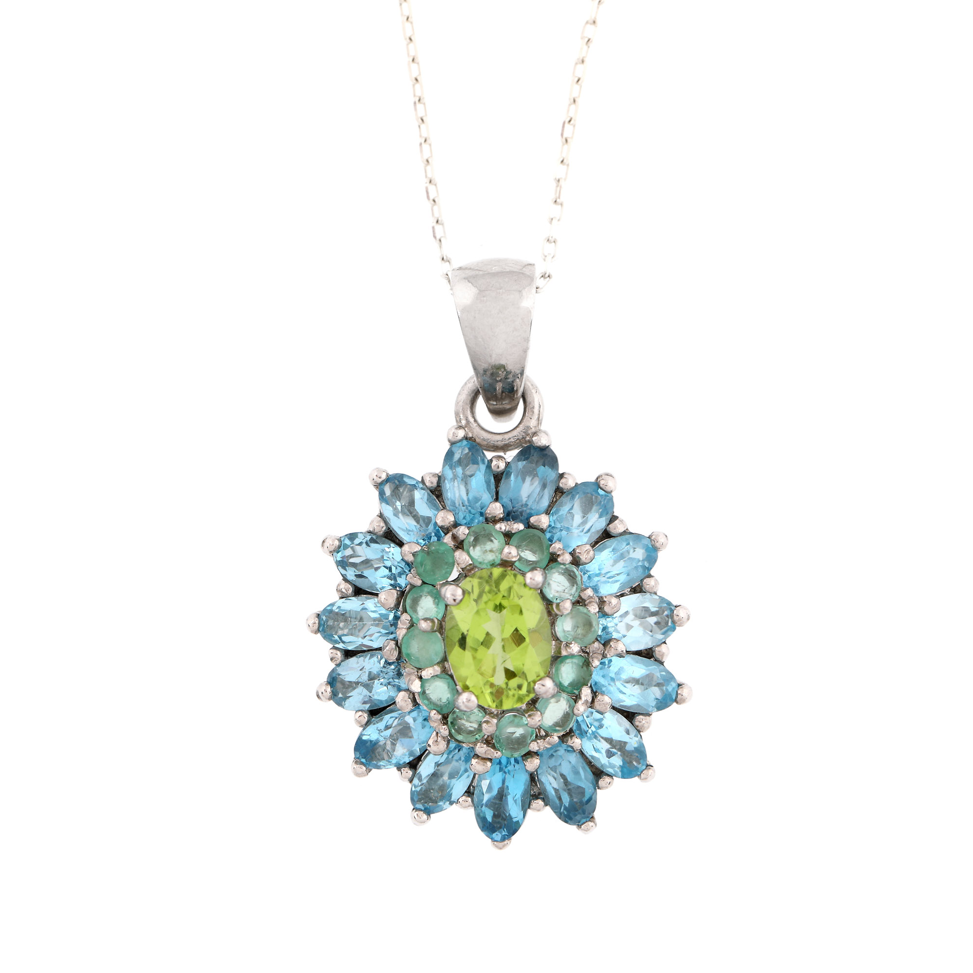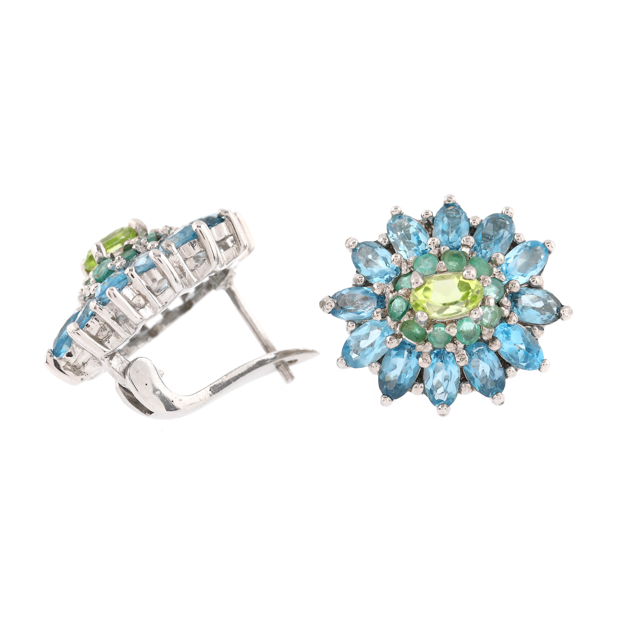 4 peridote oval fațetate, culoare verde-galben, claritate SI, cca. 3,55 ct.; 42 smaralde rotund fațetate, culoare verde, claritate moderately included, cca. 1,05 ct. și 52 topaze oval fațetate, culoare bleu, claritate eye-clean, cca. 16 ct.
