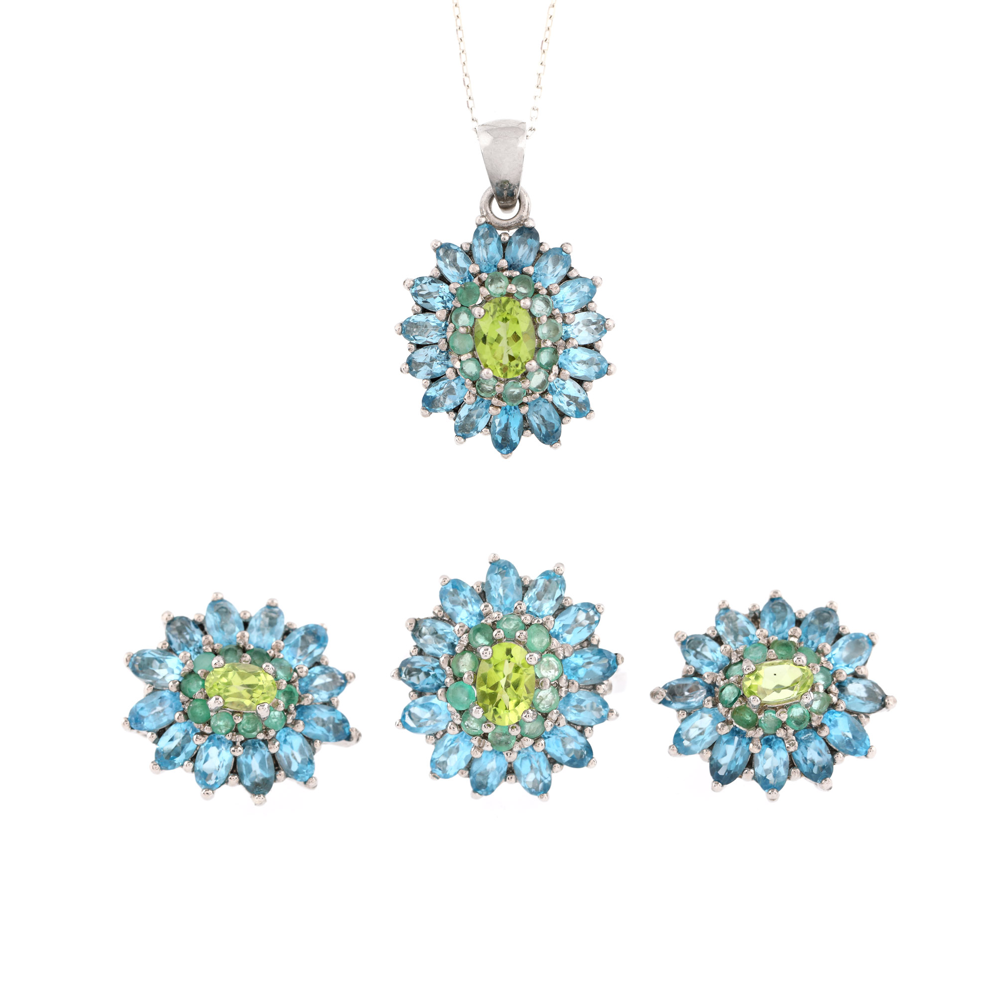 38. Set din argint, format din lanț cu pandantiv, pereche de cercei și inel, decorat cu topaze, peridote și smaralde