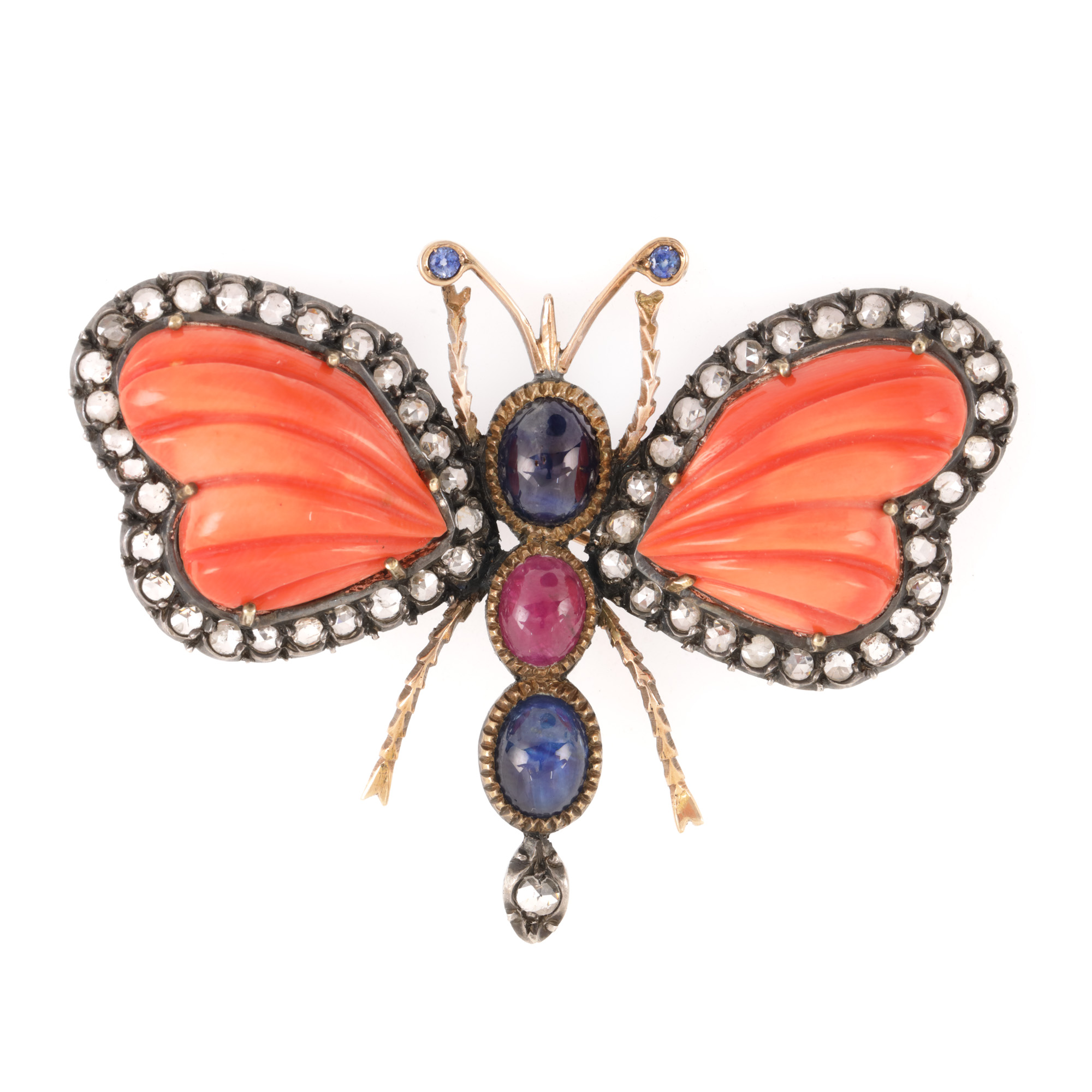 40. Broșă din aur, sub formă de fluture, decorată cu rubin, safir, diamante și coral
